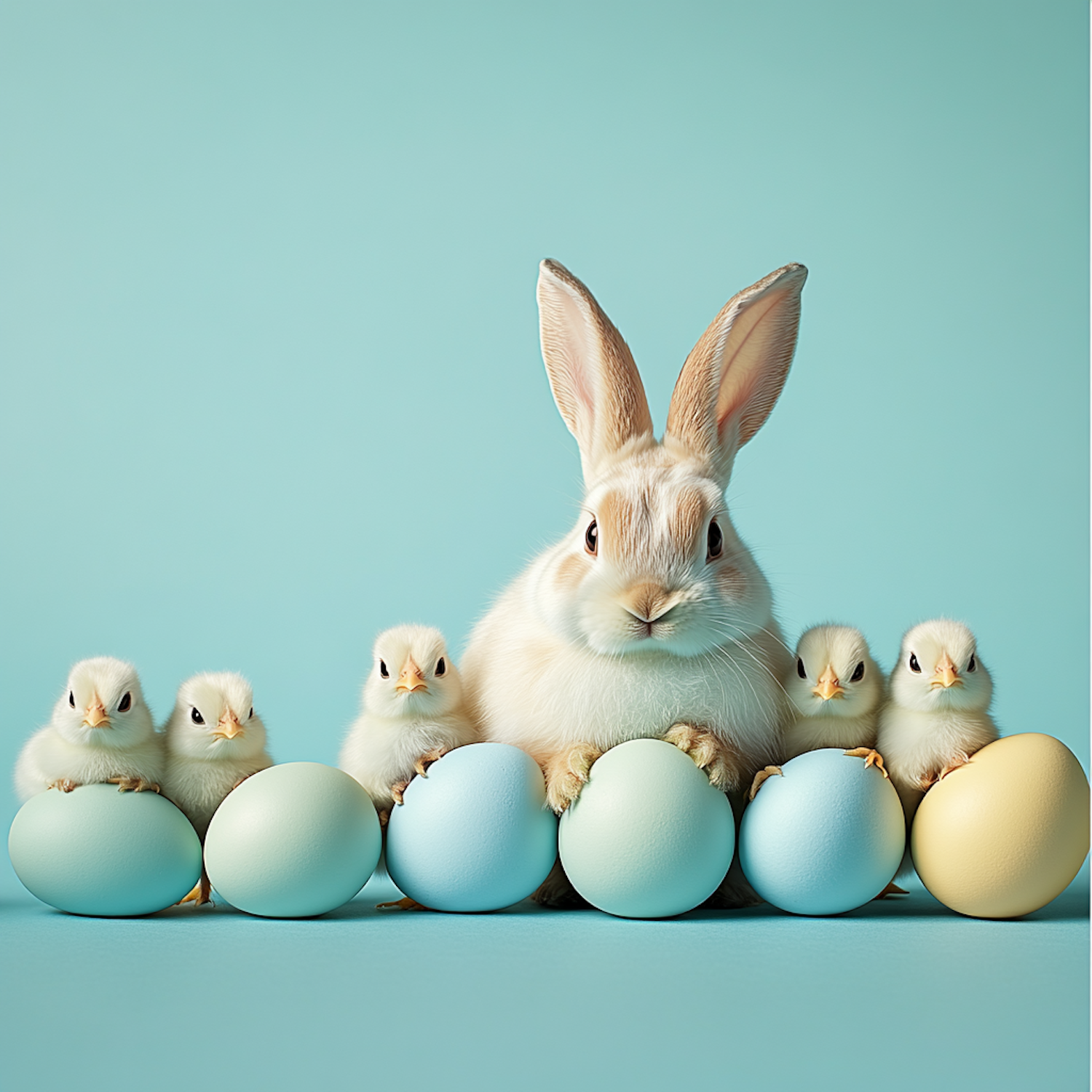 Adorable white rabbit with pastel eggs and fluffy chicks on a teal background. Perfect springtime or Easter-themed image!
