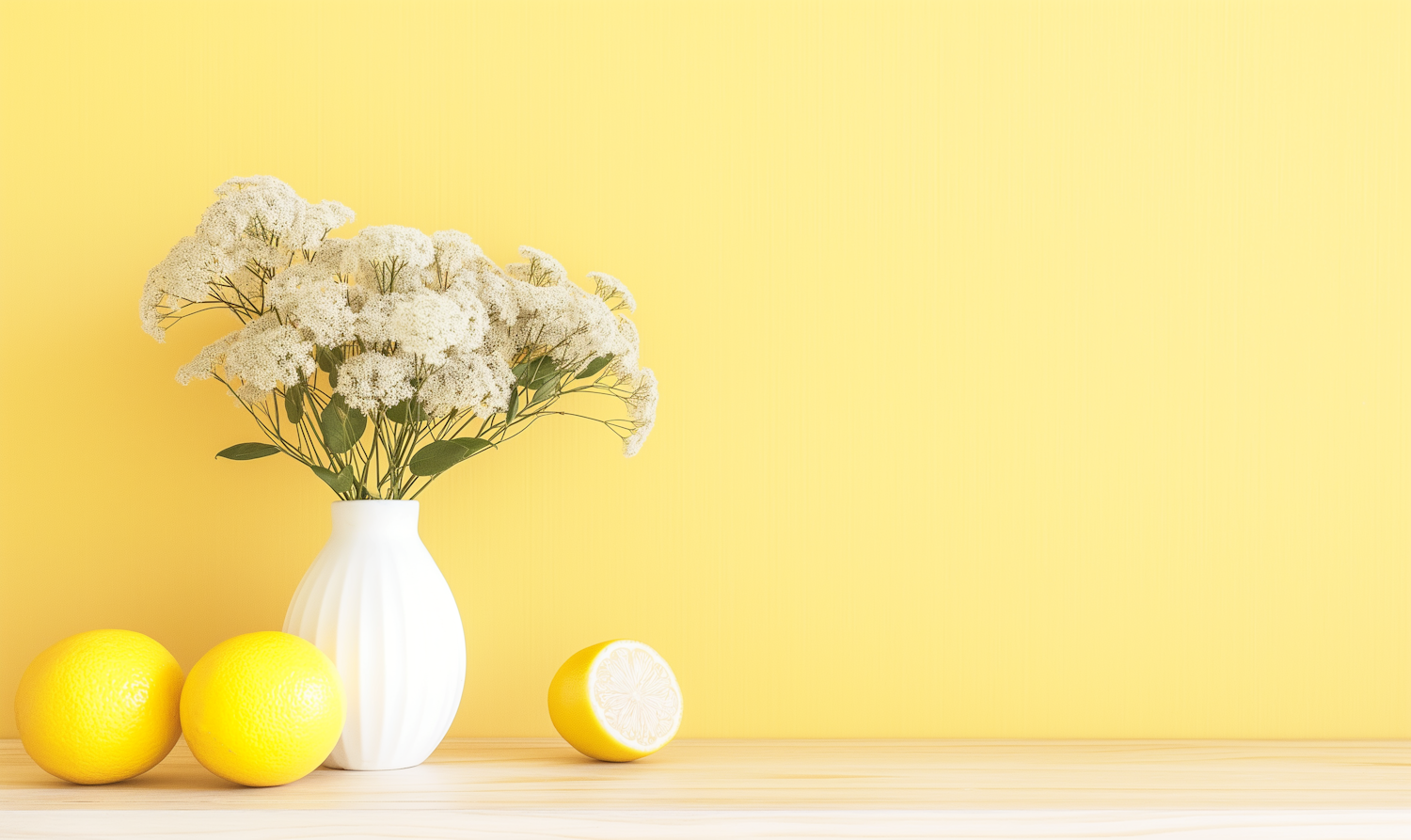 Minimalist scene with white flowers in a vase and lemons on a wooden surface against a yellow background.