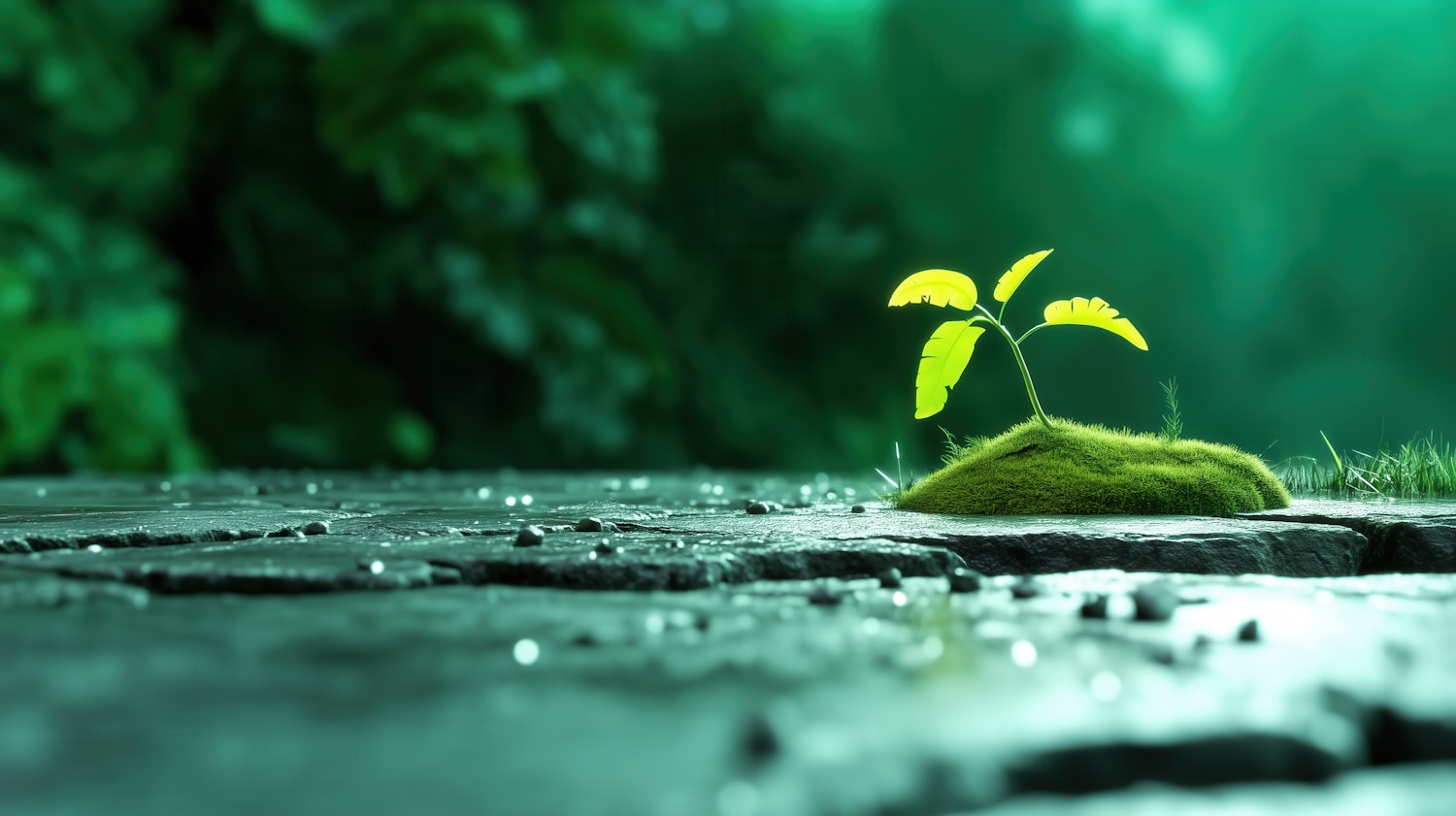 A glowing green sprout grows from moss on a cracked stone surface, symbolizing resilience and nature's beauty.