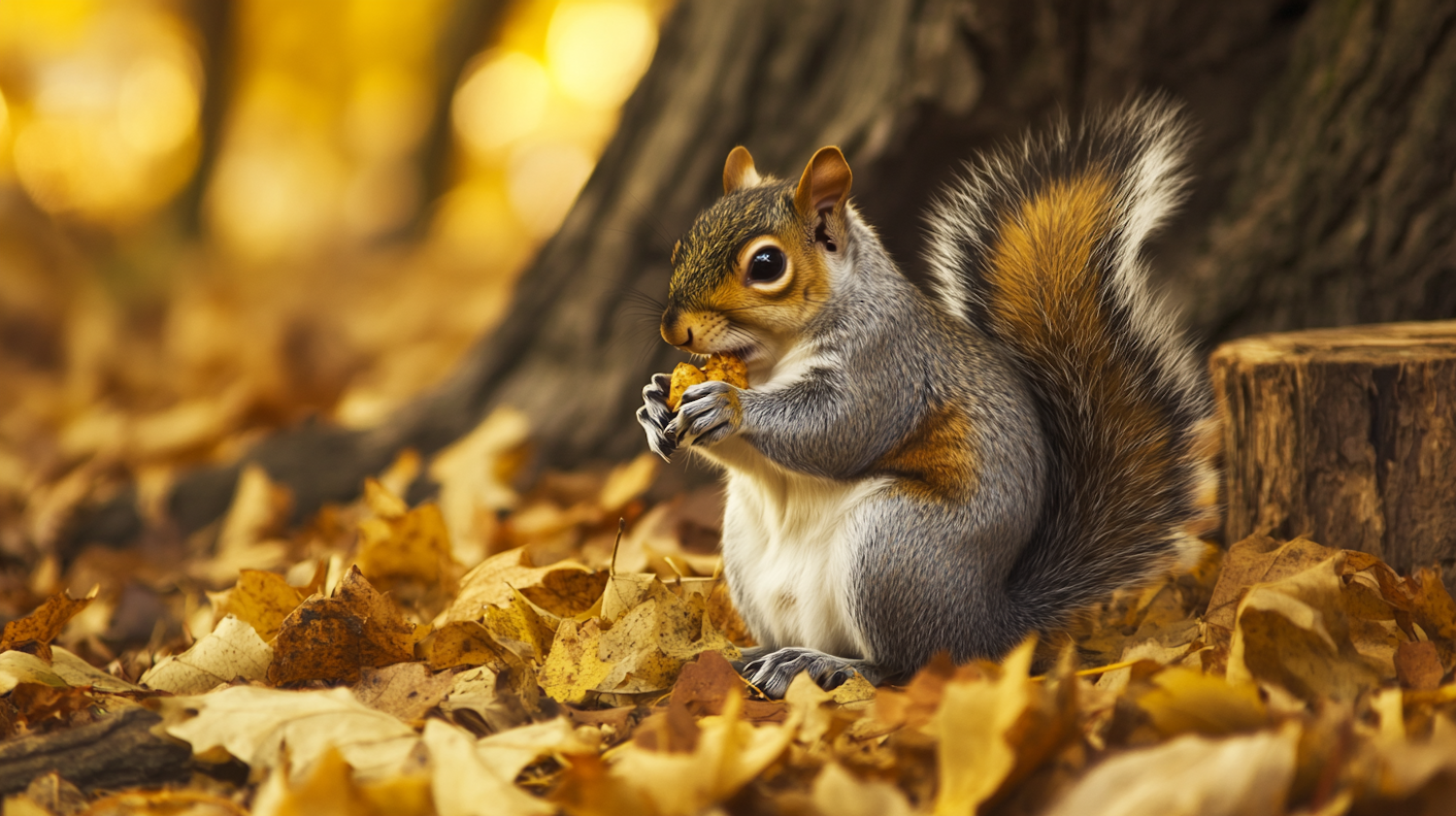 A squirrel with a bushy tail sits among autumn leaves, holding a nut. Warm golden hues create a tranquil fall forest scene.