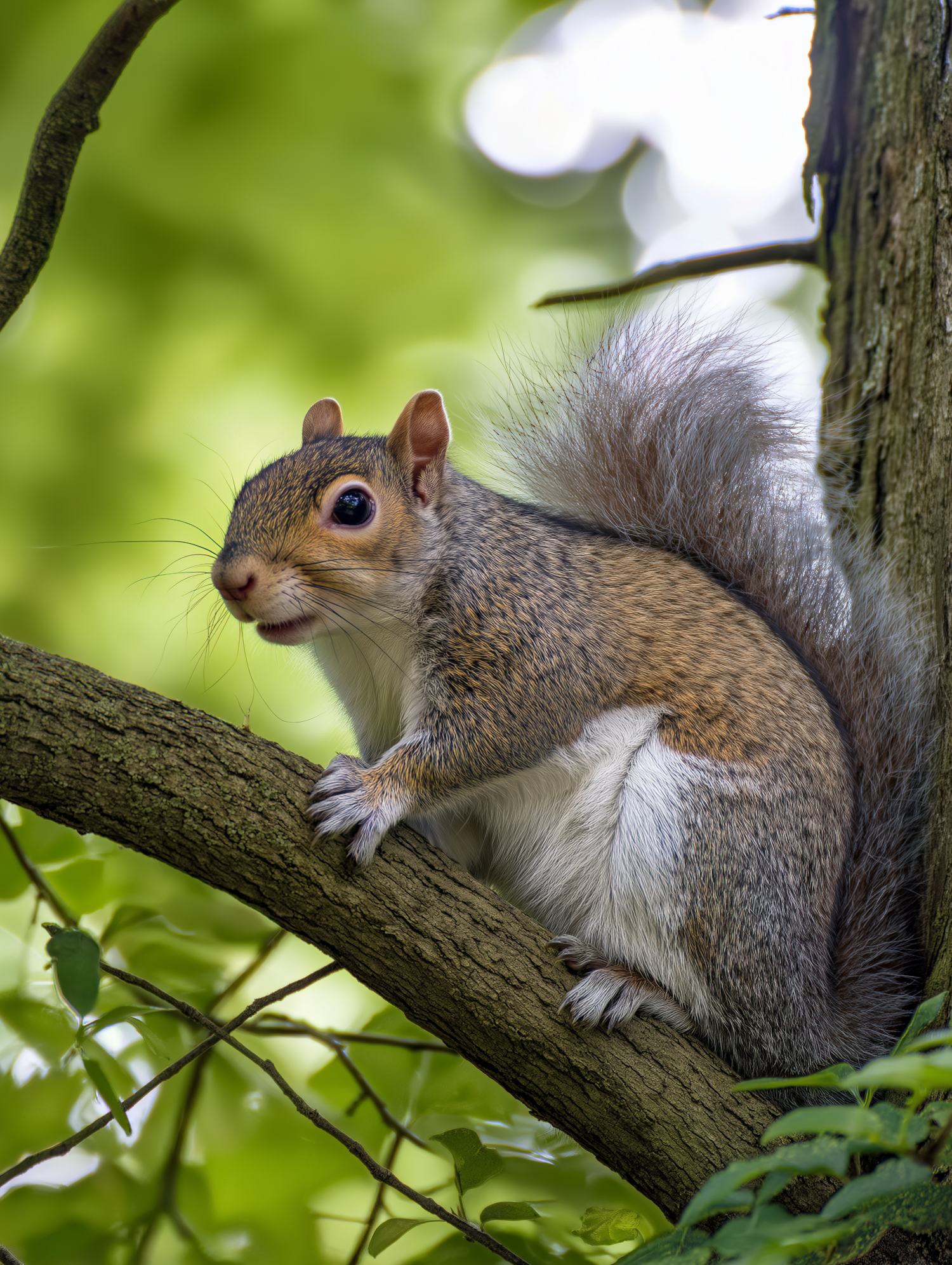 A squirrel perched on a tree branch amidst vibrant green foliage, showcasing its bushy tail and alert expression.