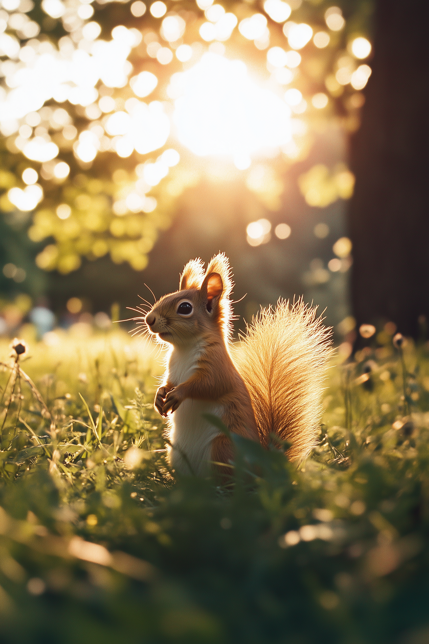 A squirrel in a sunlit meadow with a glowing tail, surrounded by lush grass and bokeh light effects from the setting sun.