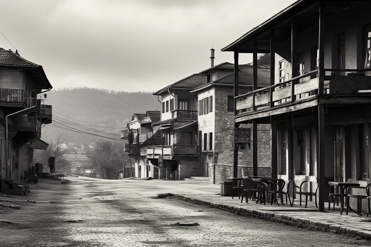 Deserted street in a small town with rustic buildings and a cloudy sky, captured in black and white for a nostalgic feel.