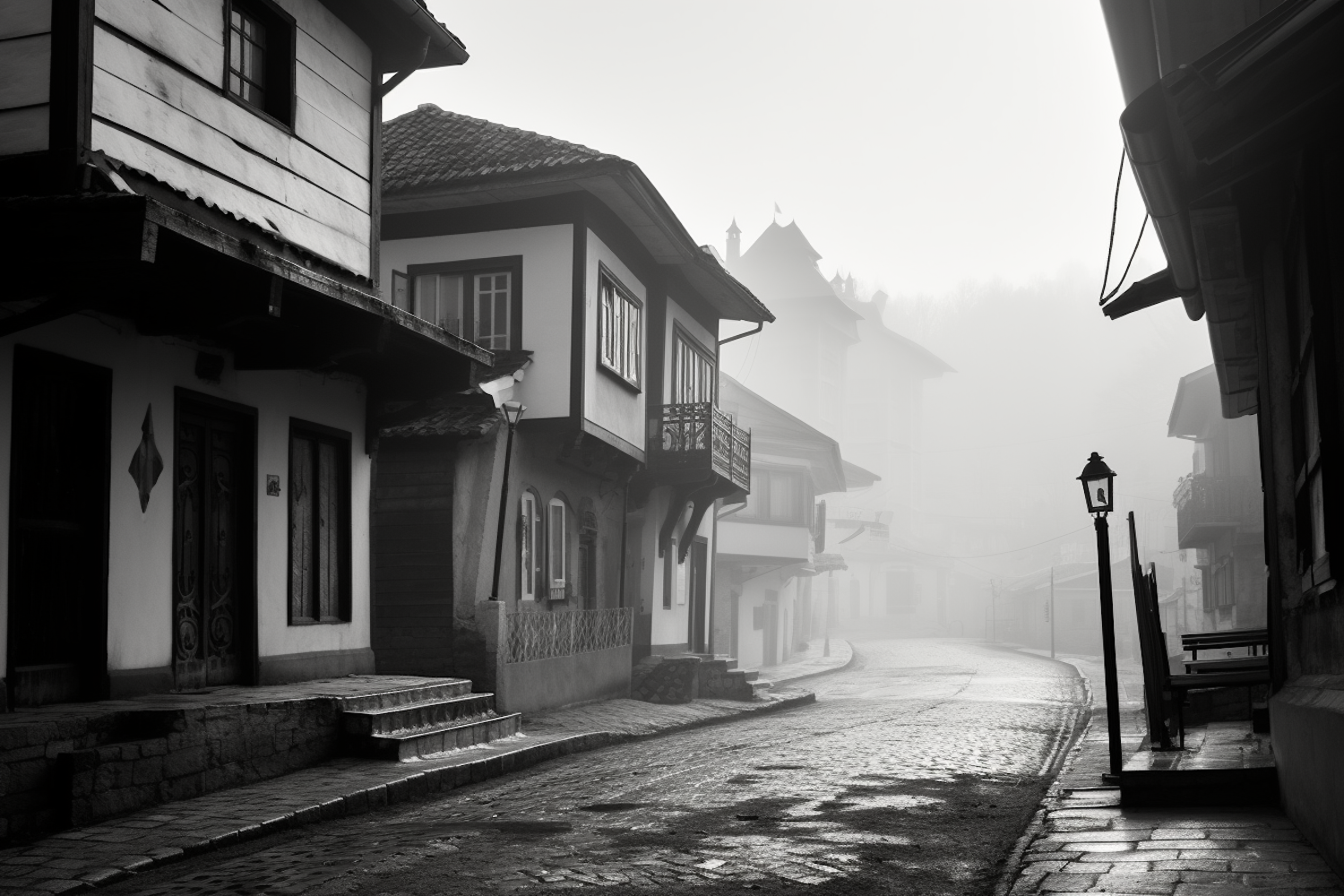 Misty cobblestone street in a quaint village with old-fashioned buildings and a lone streetlamp, creating a serene, nostalgic atmosphere.