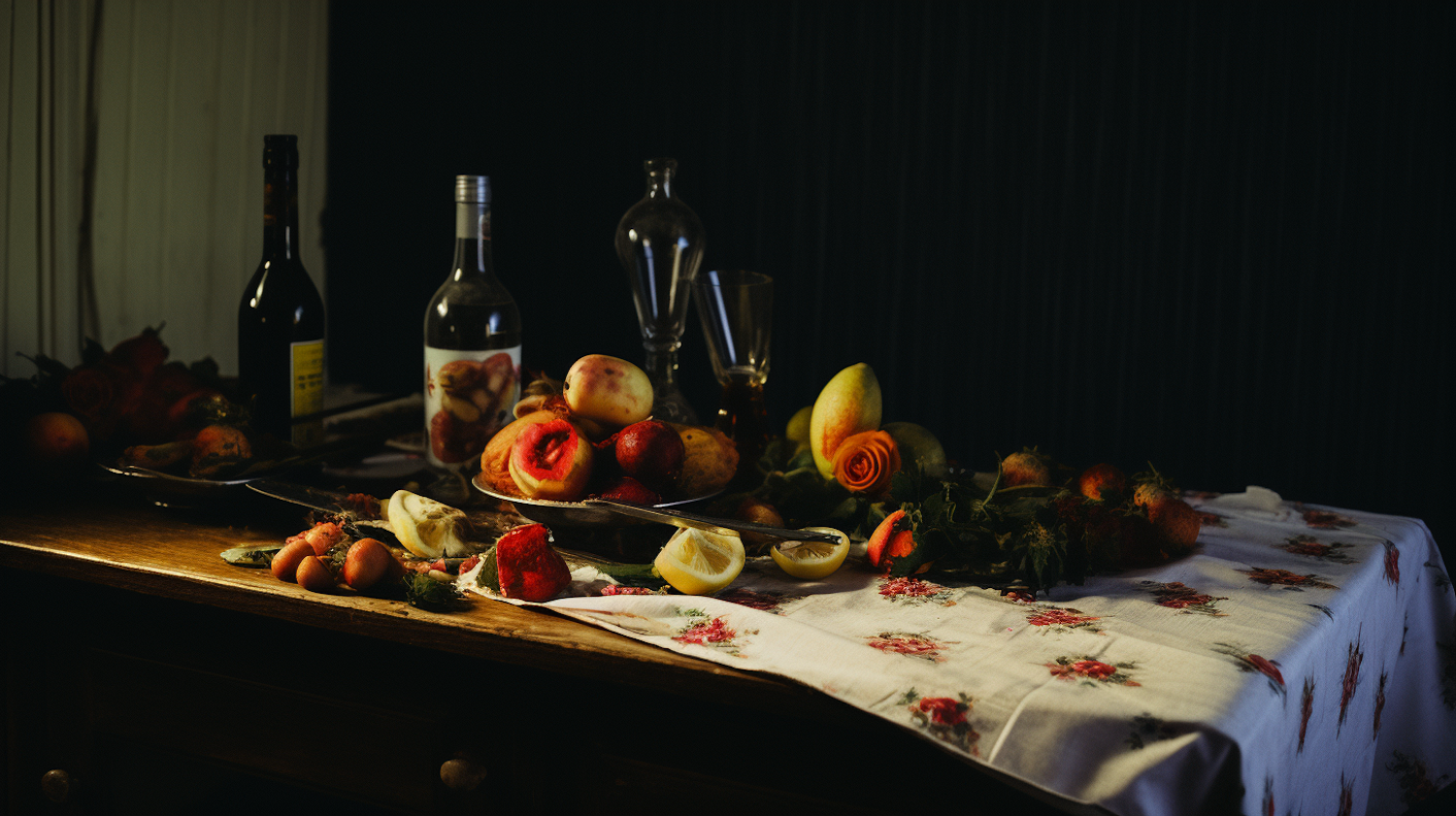 Elegant still life with fruits, bottles, and glasses on a floral tablecloth, capturing a classic and artistic arrangement.