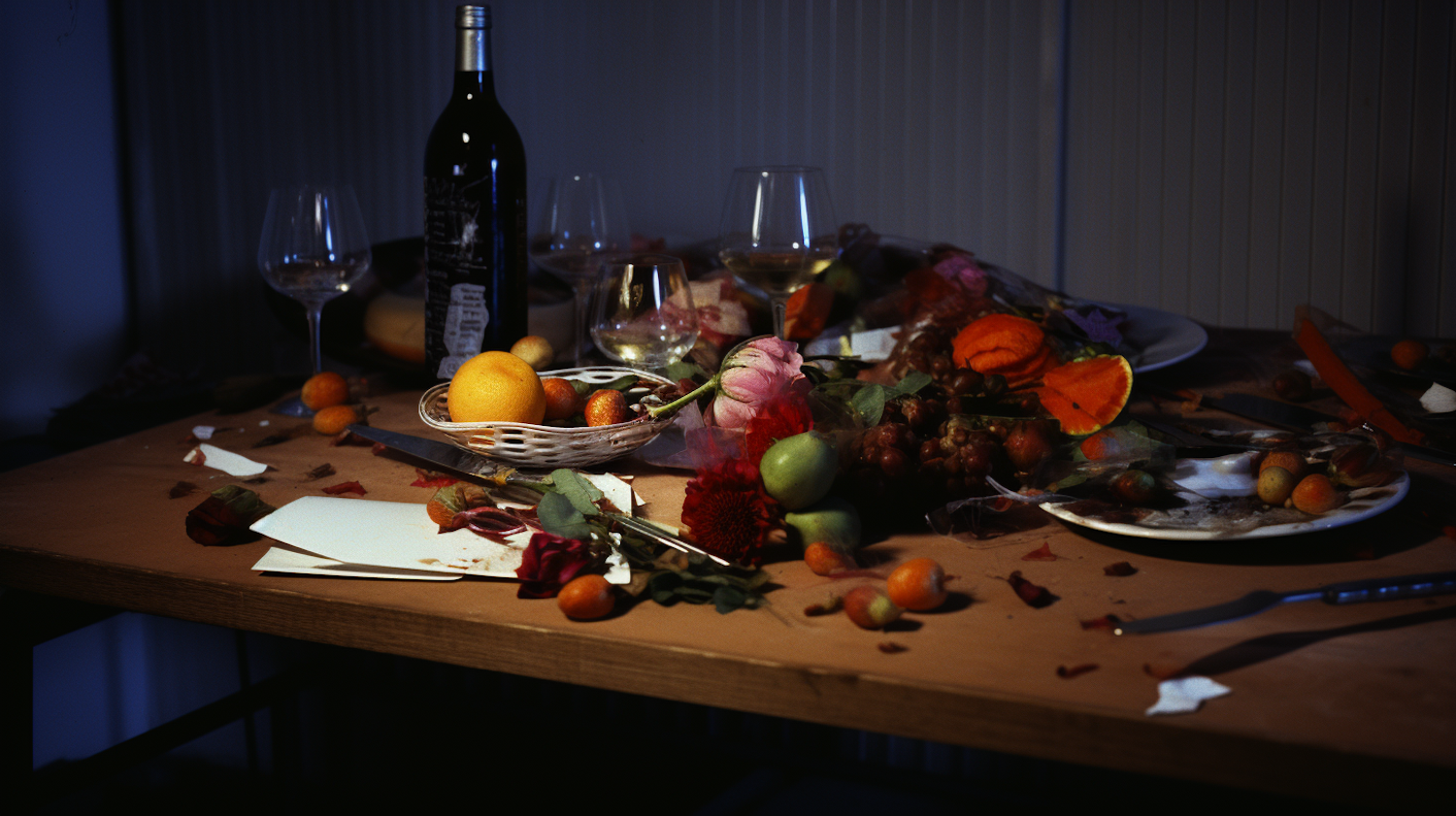 A dimly lit table with wine, fruits, flowers, and scattered remnants of a meal, evoking a post-celebration ambiance.