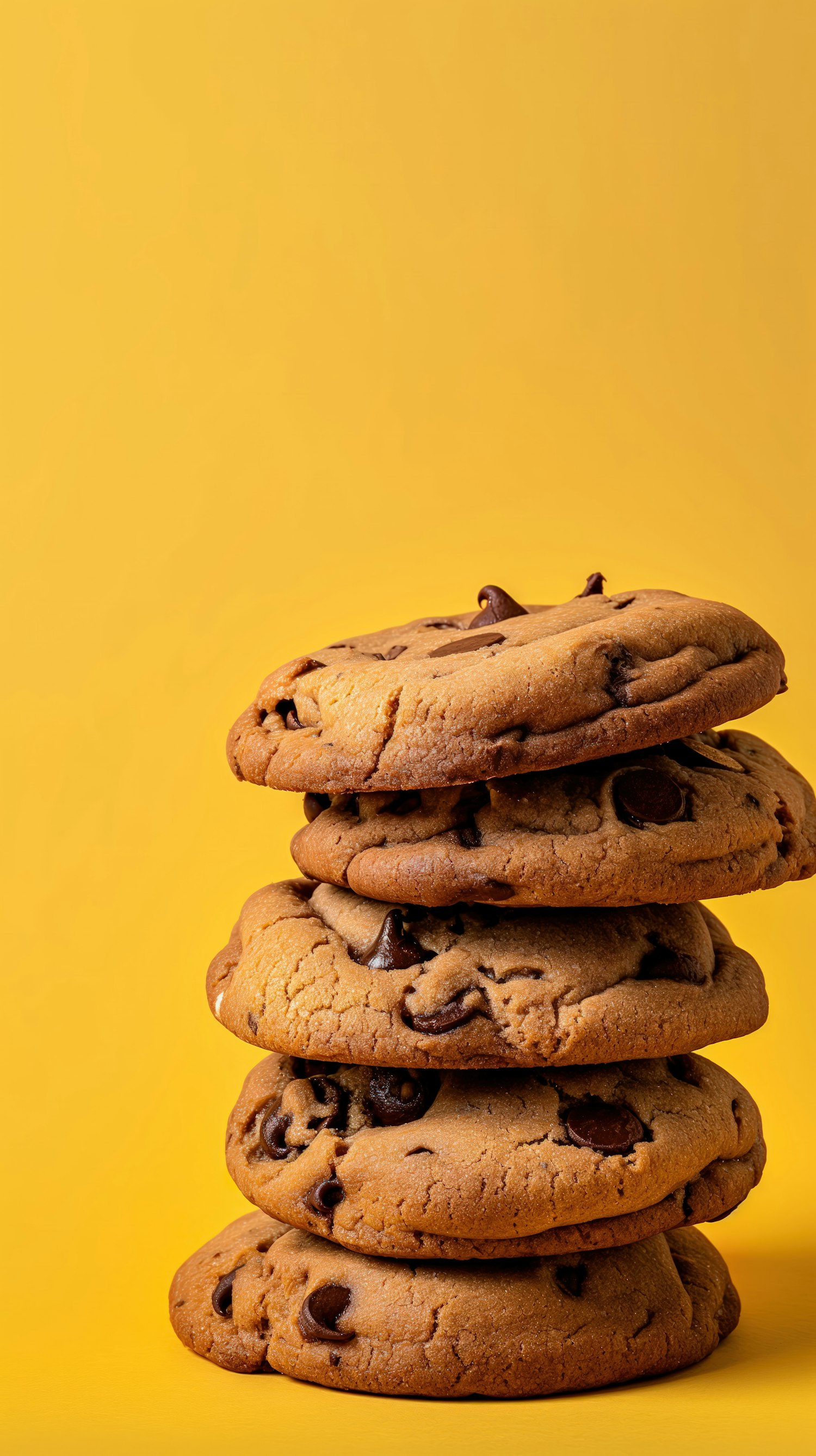Stack of five chocolate chip cookies against a vibrant yellow background, highlighting their golden brown color and rich chocolate chips.