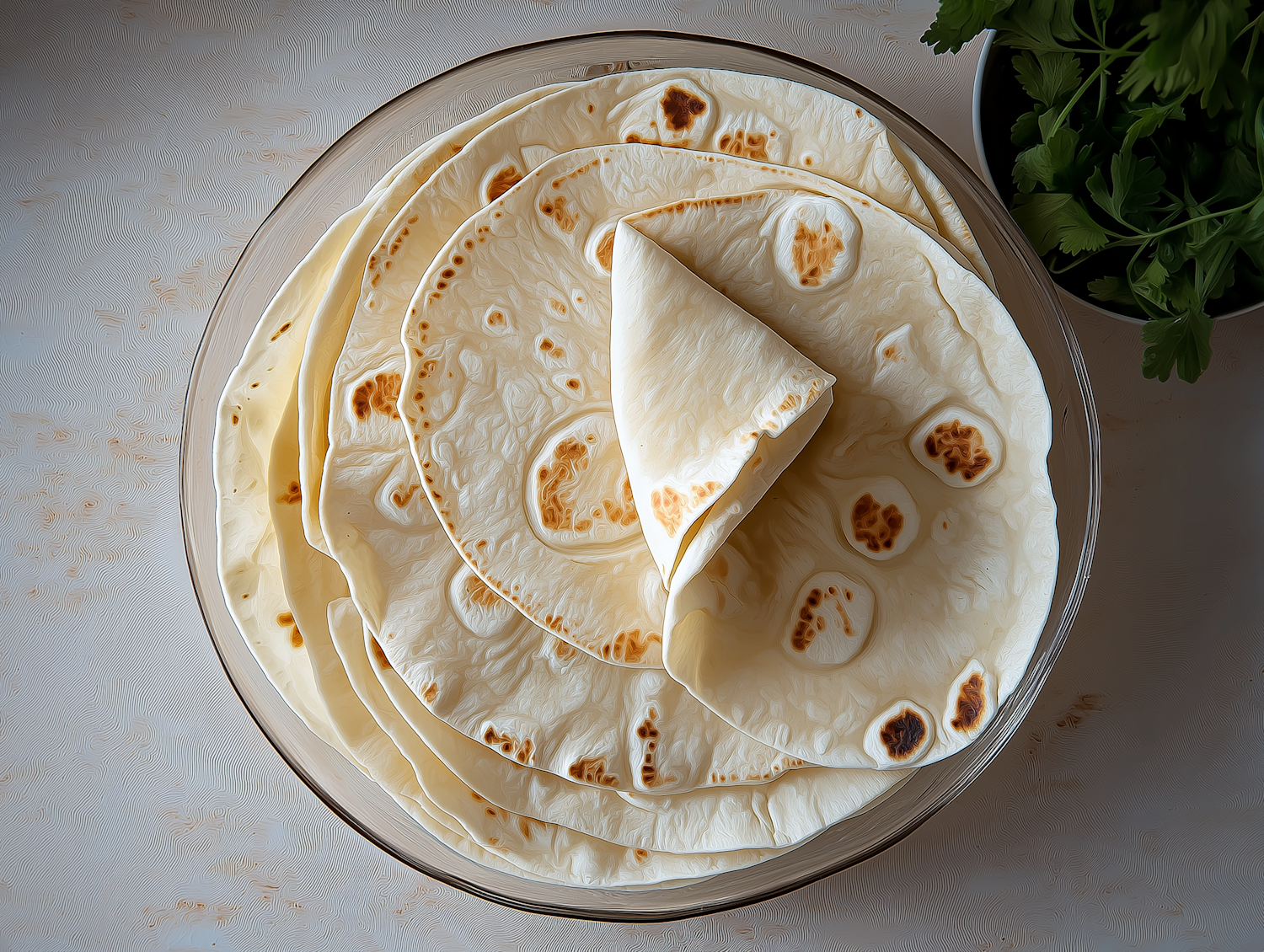 Stack of golden-brown spotted flatbreads in a glass bowl with fresh parsley in the background, showcasing soft and fresh textures.