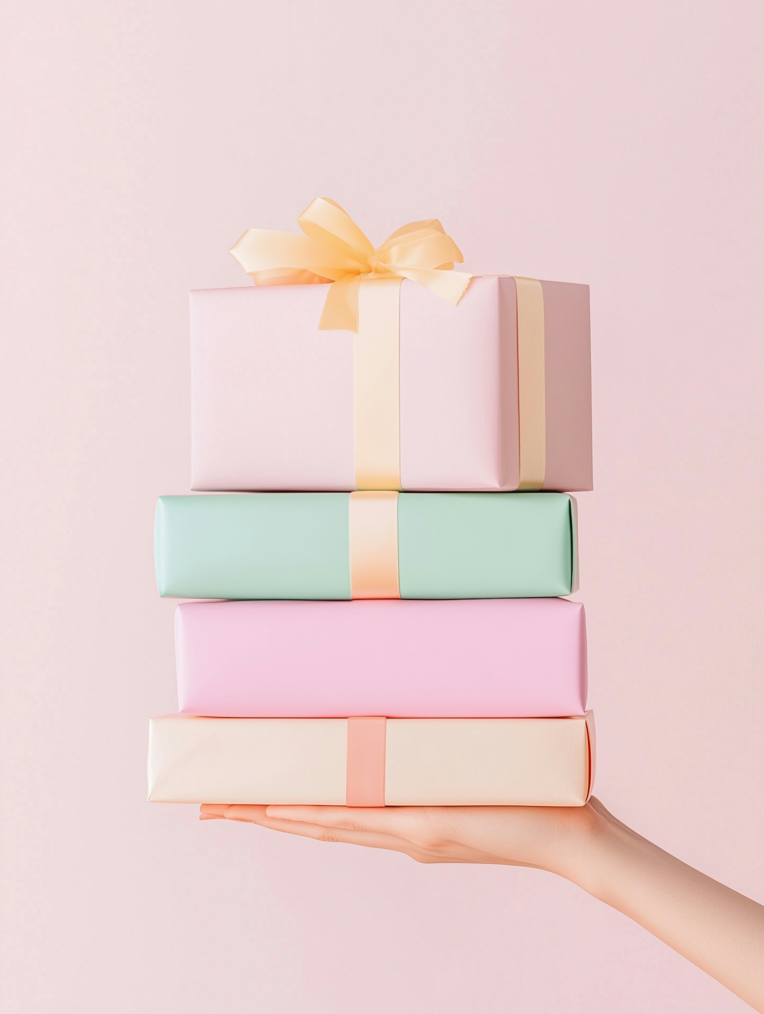 Stack of pastel gift boxes with ribbons on a hand against a pink background, showcasing elegant and minimalistic design.