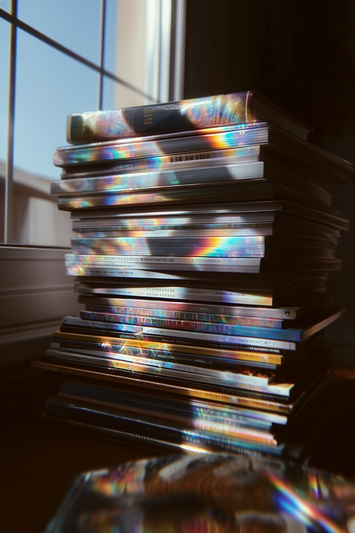 A stack of glossy magazines near a window, reflecting sunlight into vibrant rainbows. Perfect for cozy, aesthetic vibes.
