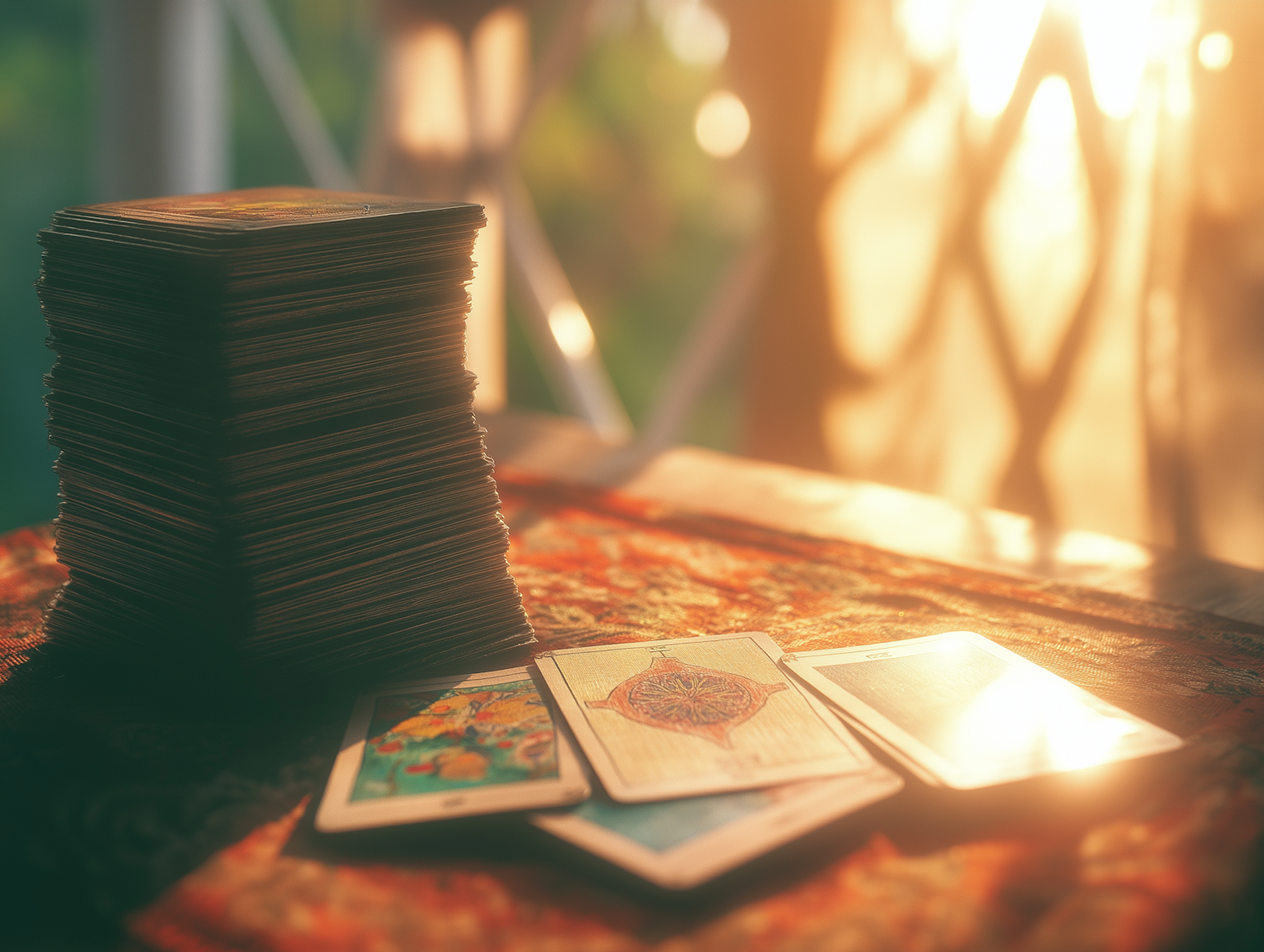 A stack of tarot cards on a patterned tablecloth, bathed in warm sunlight, creating a mystical and serene atmosphere.