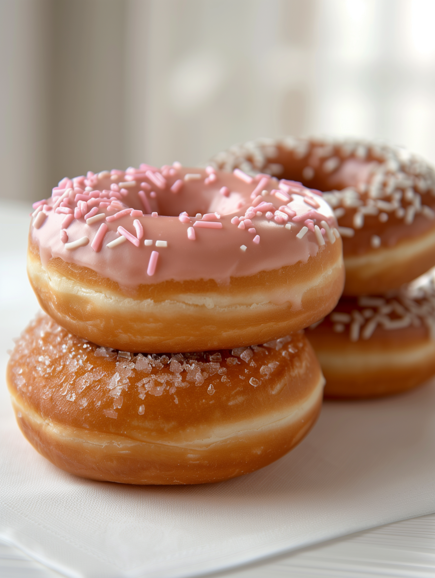 Stack of glazed donuts with pink icing and sprinkles on a white napkin, perfect for a sweet treat.