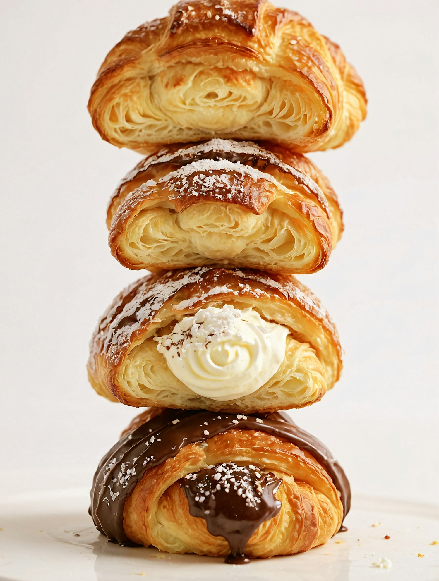A stack of flaky croissants with whipped cream, chocolate drizzle, and powdered sugar, perfect for pastry lovers.