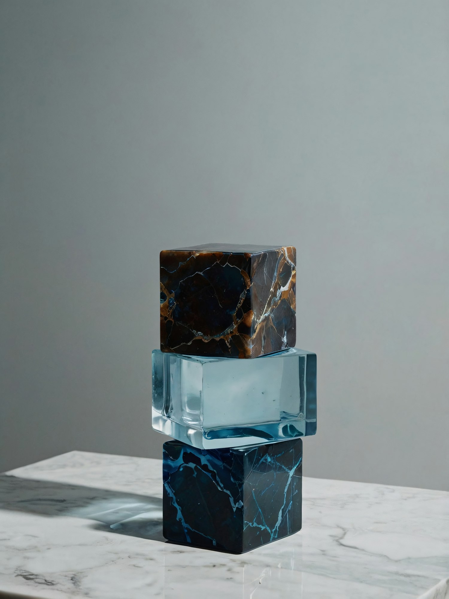 Stacked marbled and glass cubes on a marble surface with soft lighting and a muted gray background.