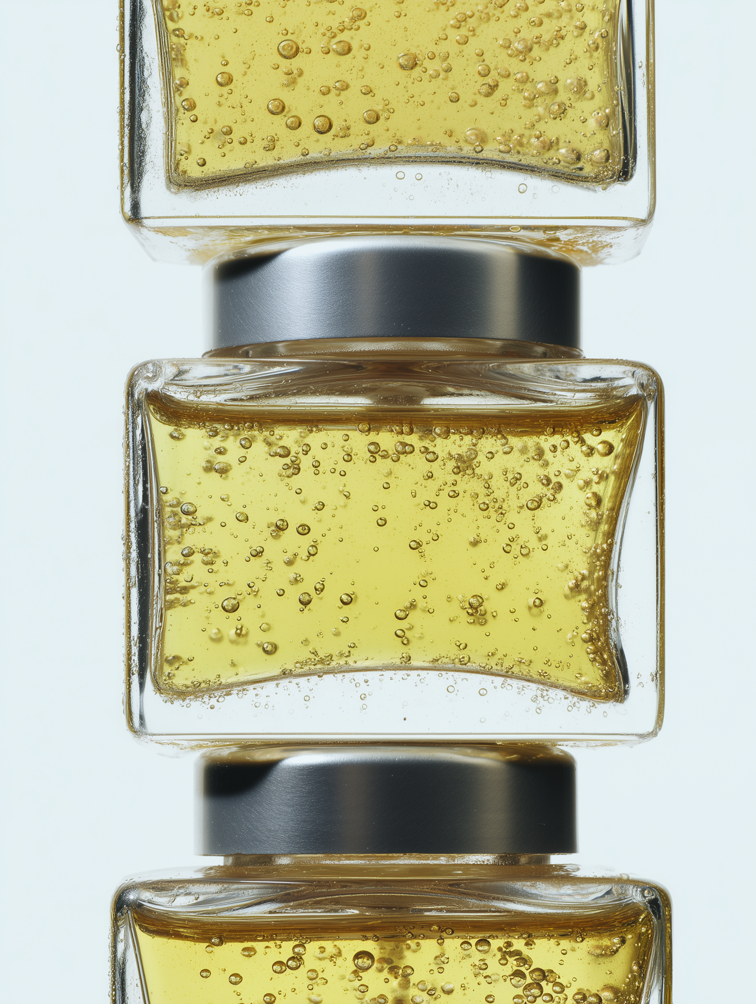 Stacked glass containers with golden liquid and bubbles, showcasing a clean and modern aesthetic against a light background.