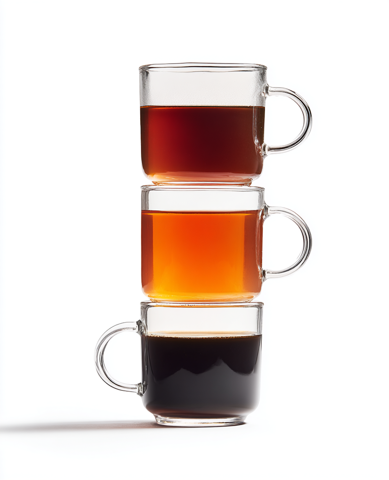 Three stacked glass mugs with varying shades of tea or coffee, showcasing a beautiful gradient of colors on a white background.