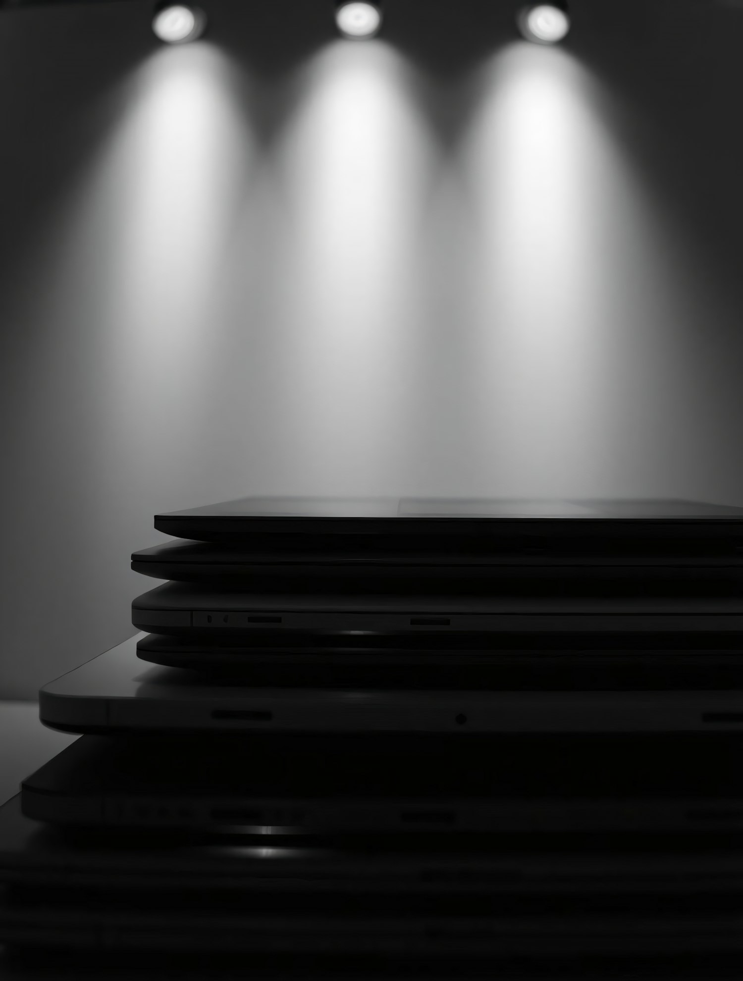 A stack of sleek laptops under dramatic lighting, showcasing their modern design in a minimalist setting.