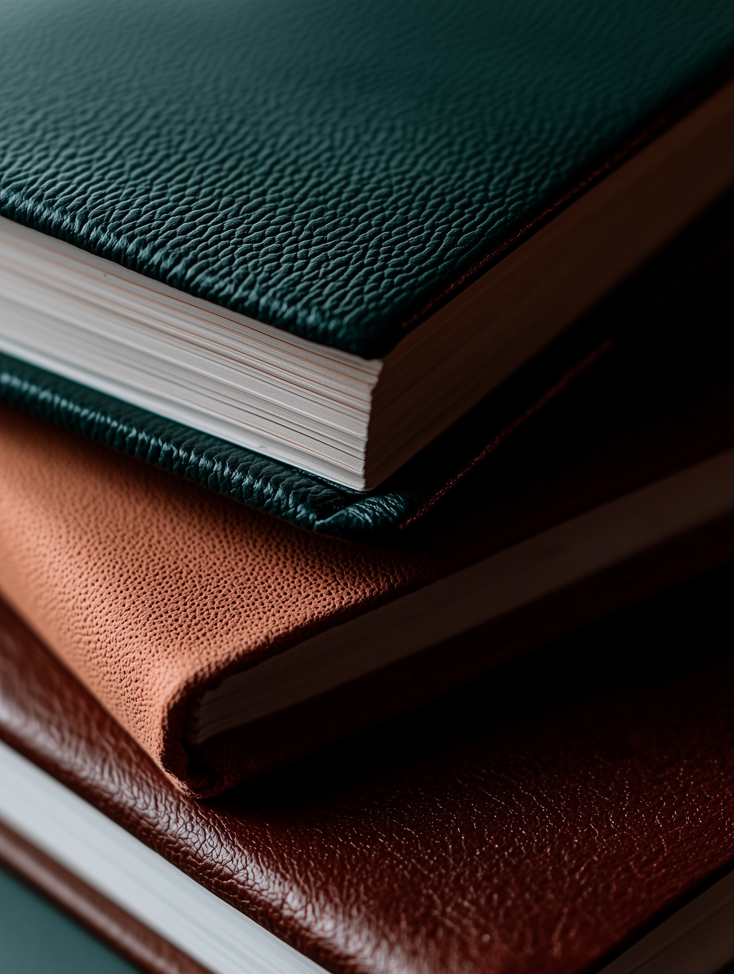 Stacked leather-bound books in green, brown, and dark brown with textured covers and white pages, perfect for a classic and elegant vibe.