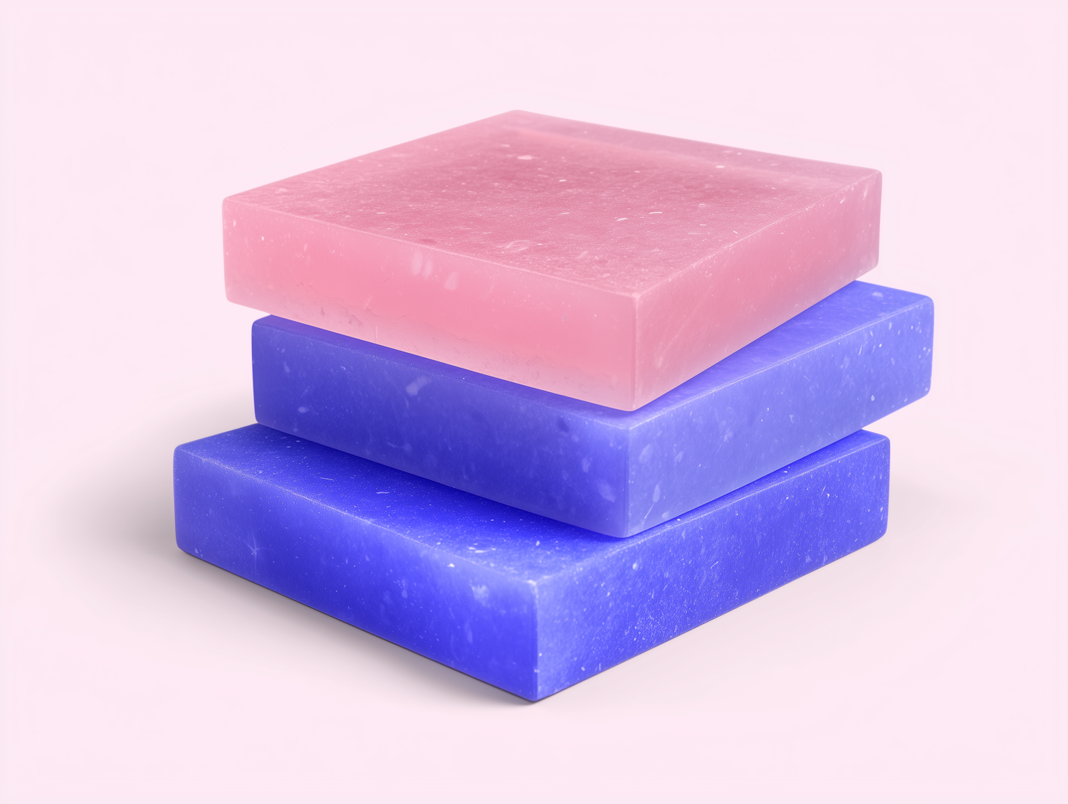Stacked pink and blue soap bars on a pastel background, showcasing a clean and minimalist aesthetic.