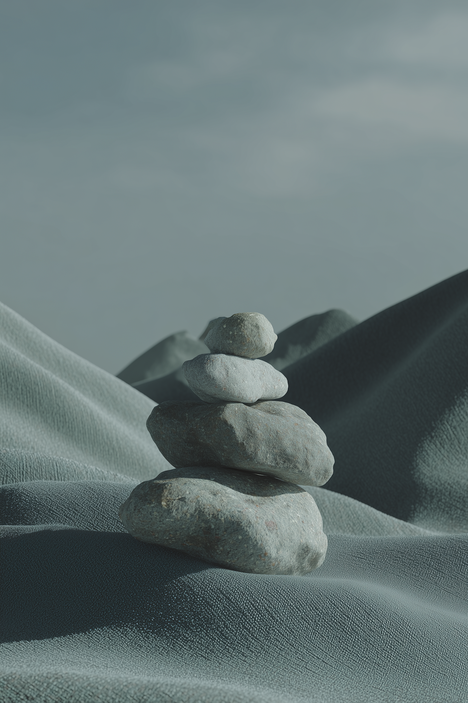 A stack of smooth stones balanced on a textured surface, with a soft blue sky in the background, creating a tranquil and minimalist scene.