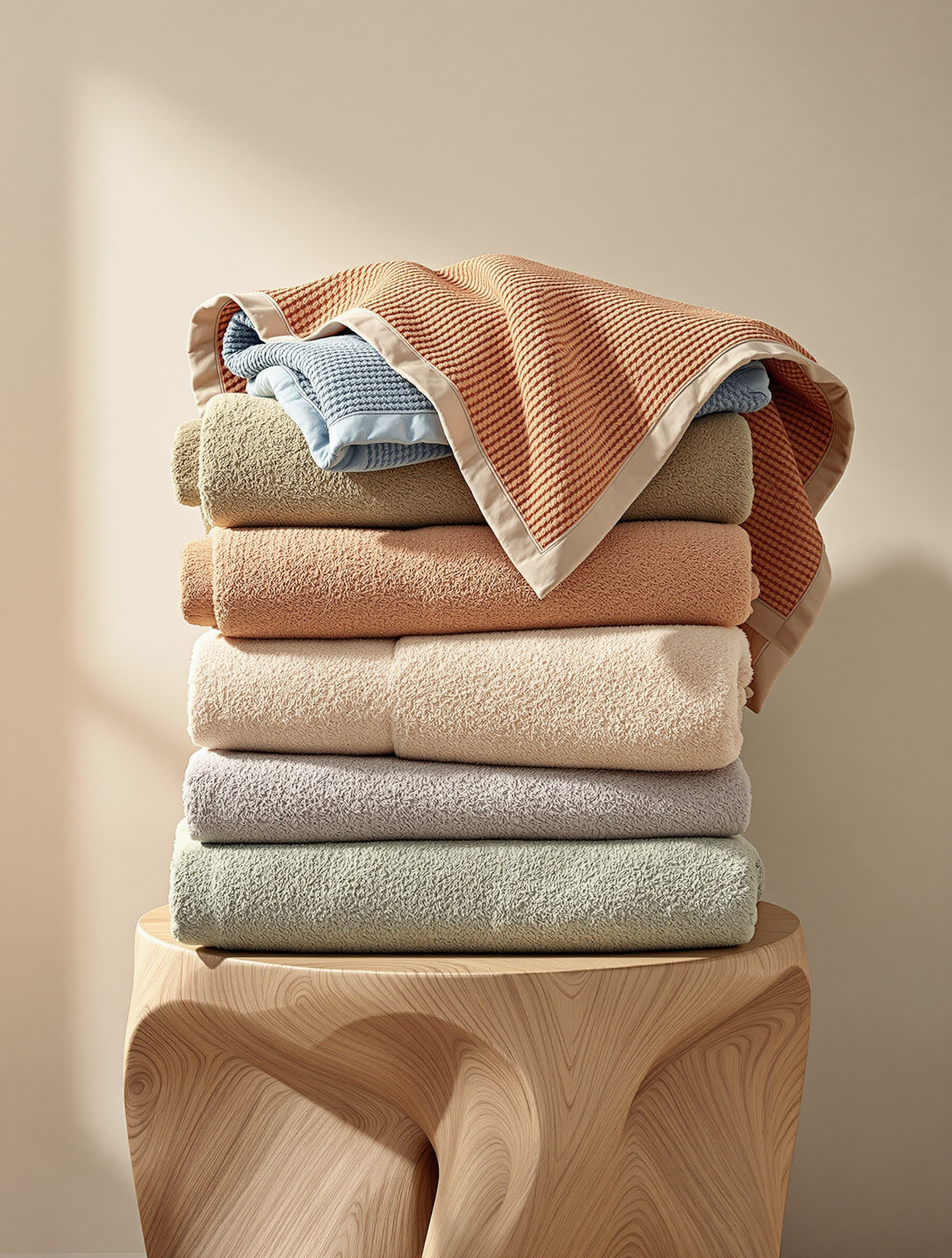A stack of soft, neutral-toned towels and blankets on a sculptural wooden stool, perfect for cozy and minimalist home decor.