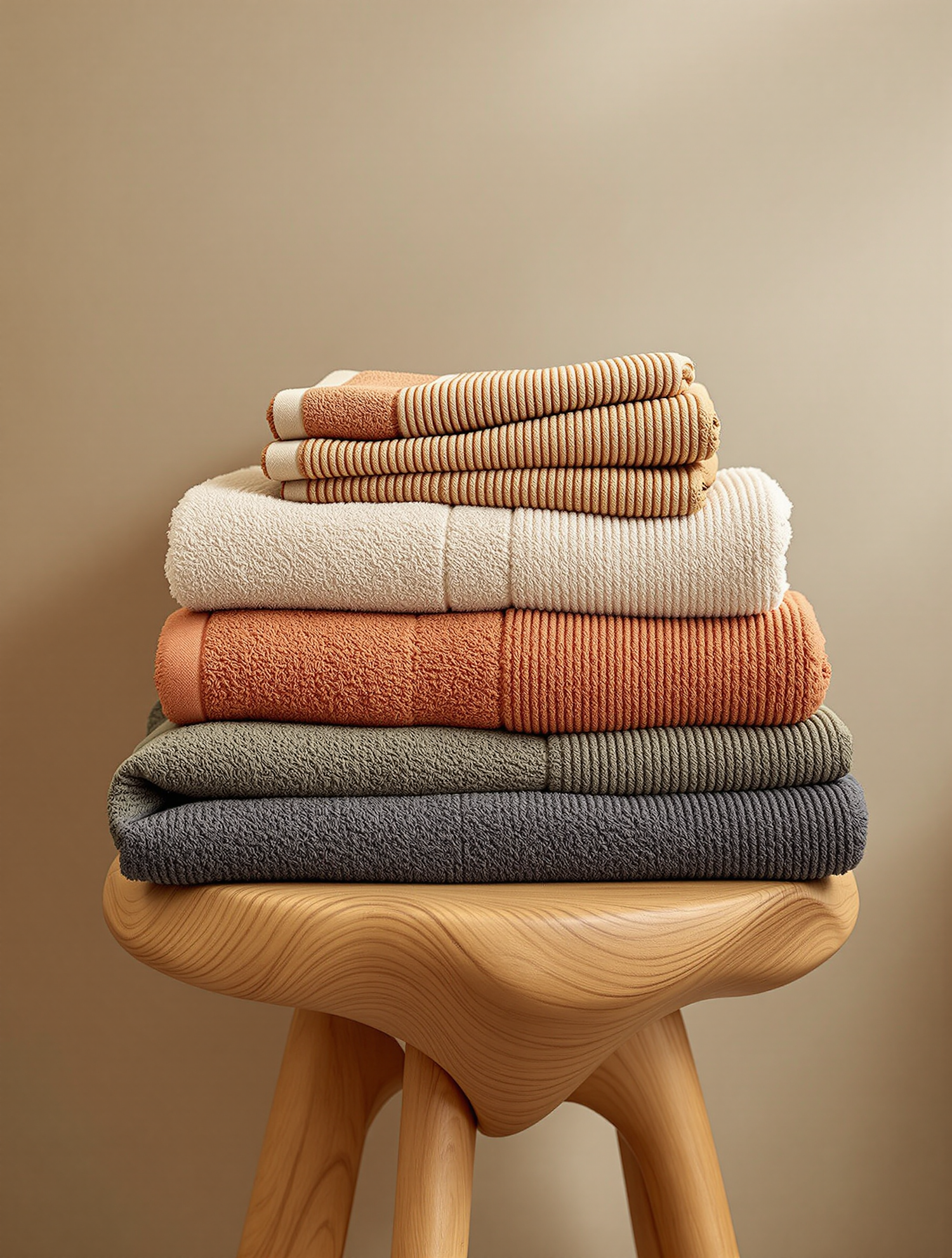 Stacked towels in warm earthy tones on a stylish wooden stool, perfect for a cozy and minimalist home decor vibe.
