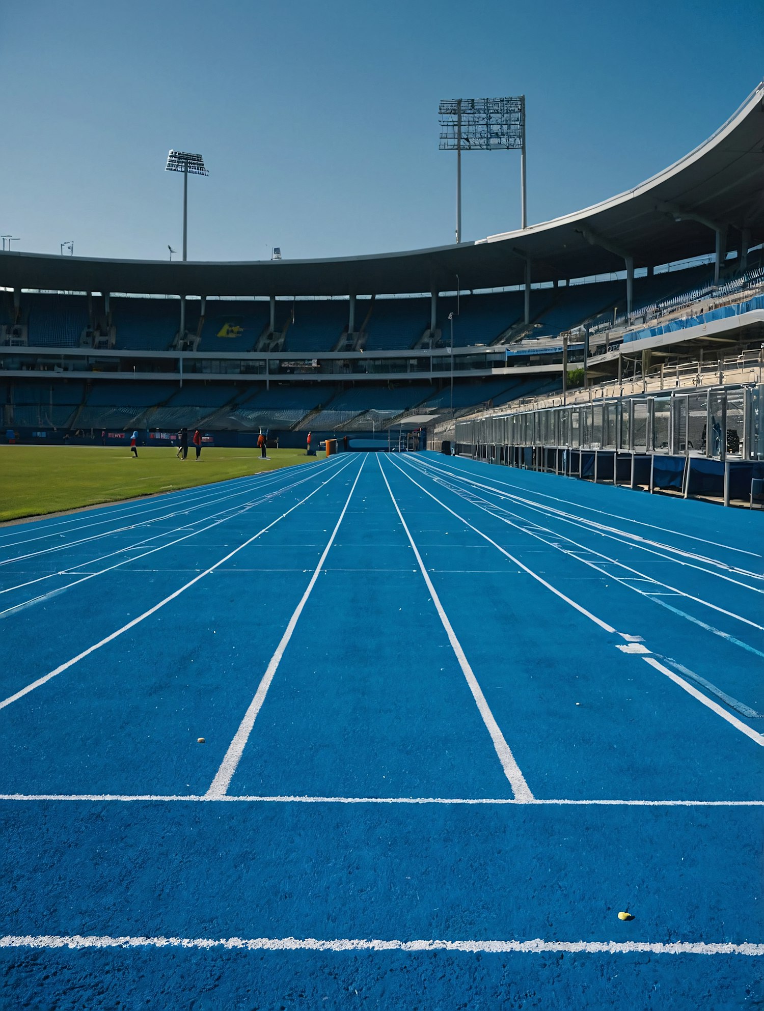 Bright blue running track in a large stadium with empty tiered seating, green field, and clear skies. Perfect for sports events.