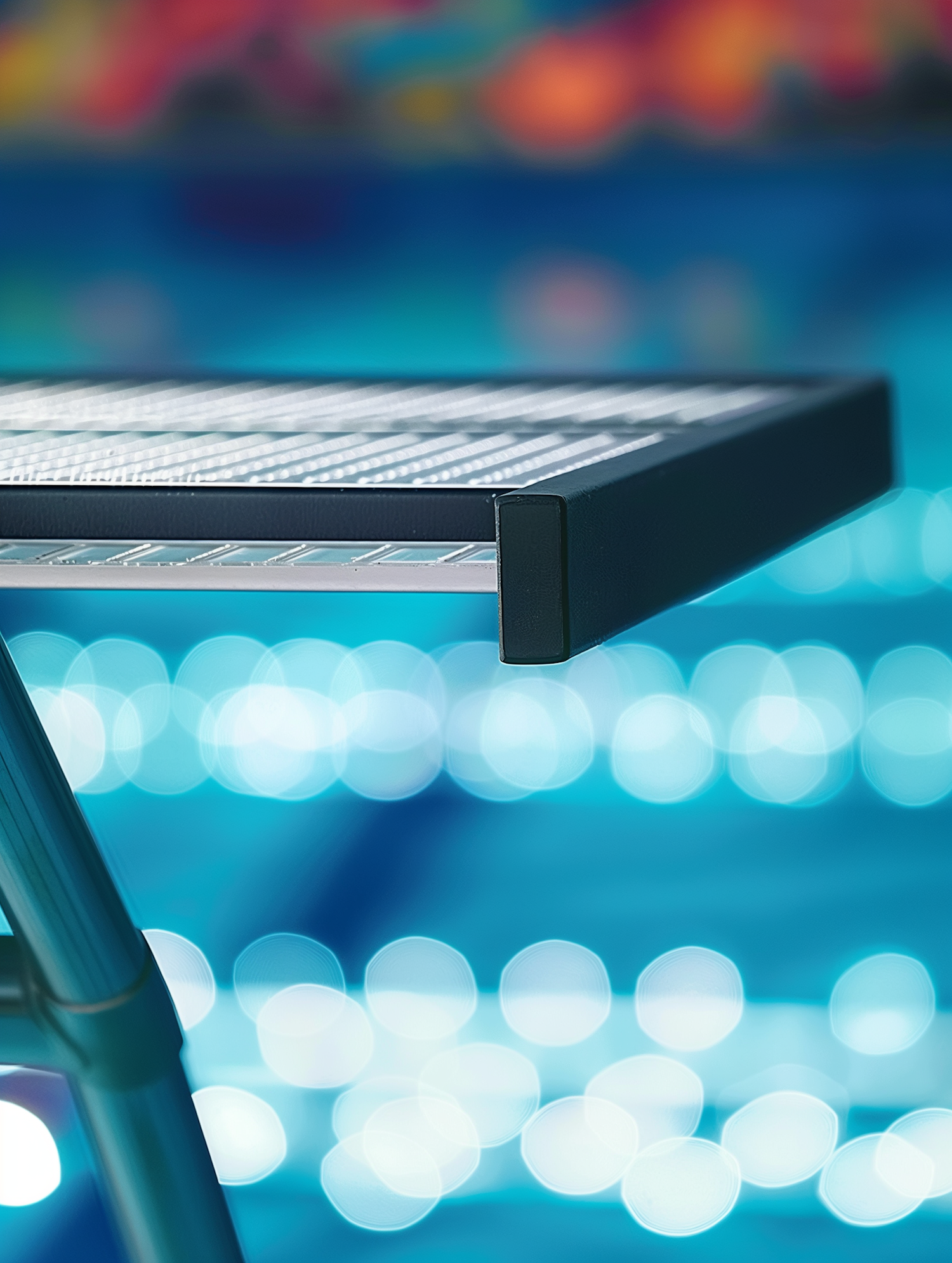 Close-up of a diving board with a textured surface, vibrant blue pool water, and colorful bokeh reflections in the background.
