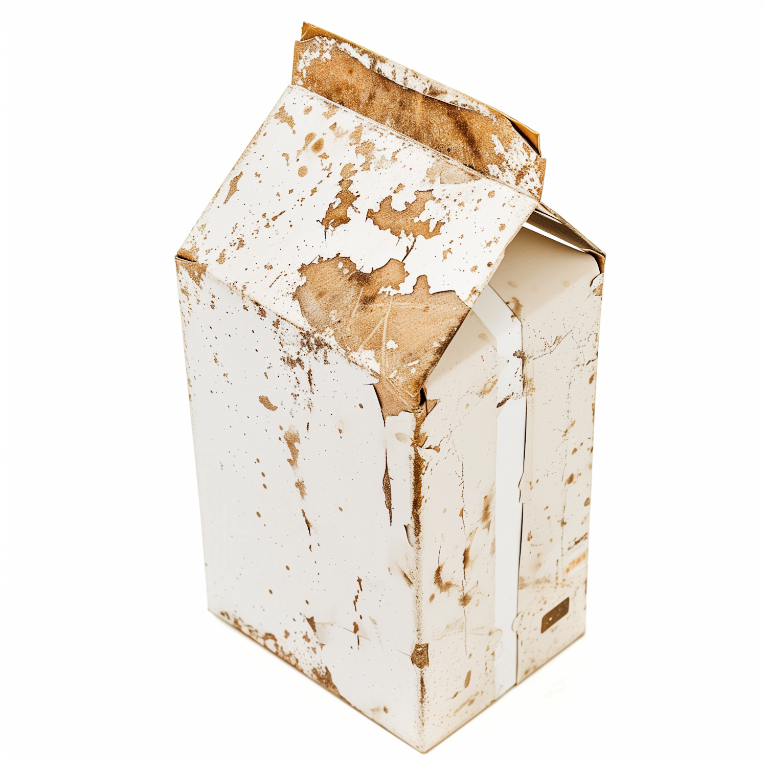 A white carton with brown stains and smudges, slightly crumpled and open, isolated on a white background.
