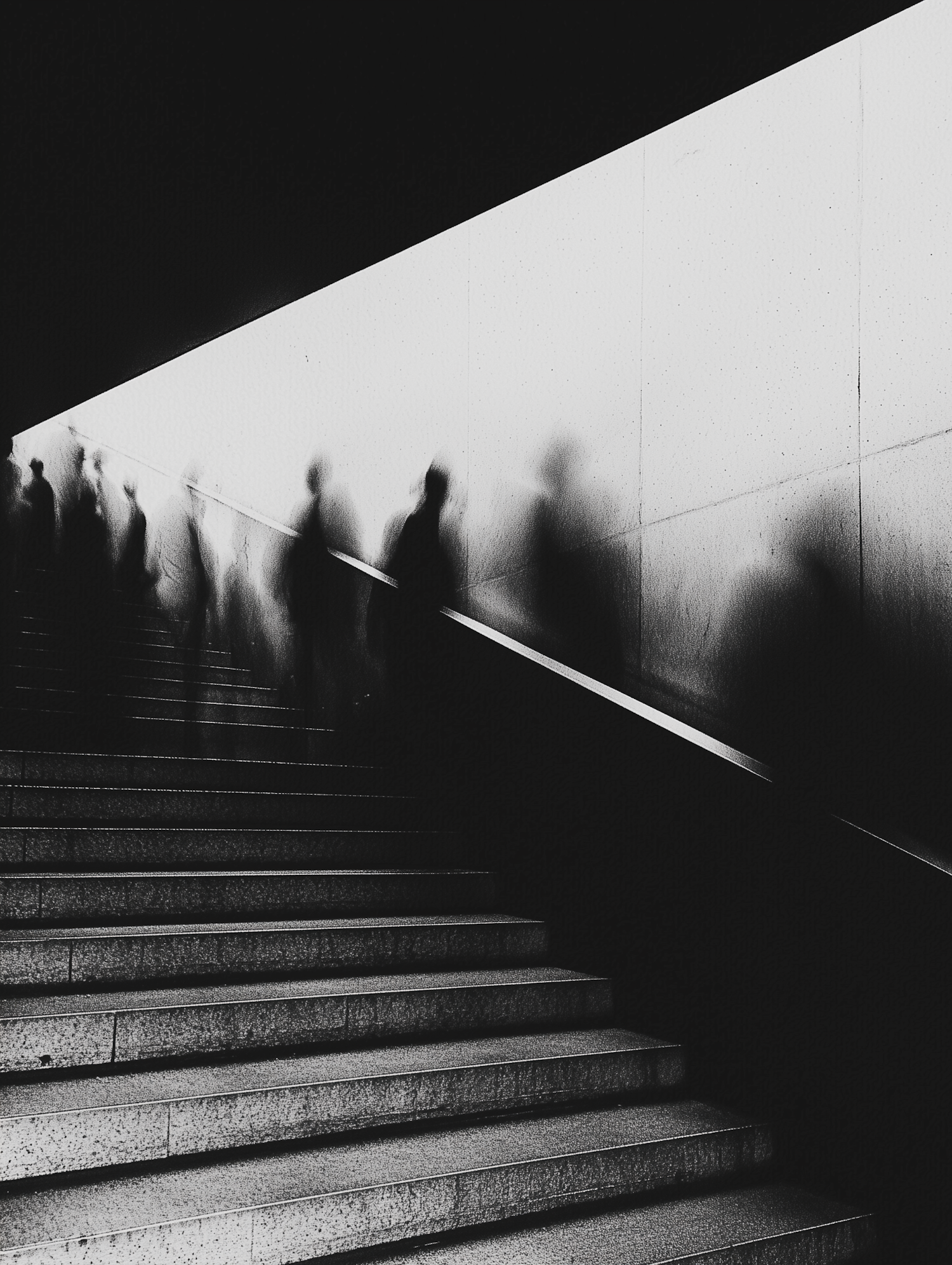 Monochrome image of blurred figures ascending a staircase, creating a ghostly, mysterious atmosphere with stark lighting contrasts.