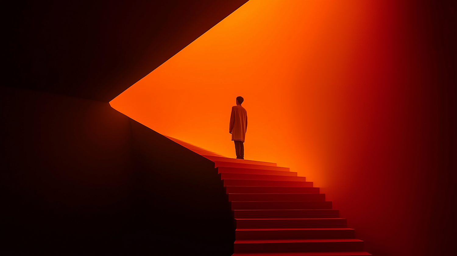 A person stands on a red staircase leading to a glowing orange light, creating a dramatic and minimalistic scene with bold contrasts.