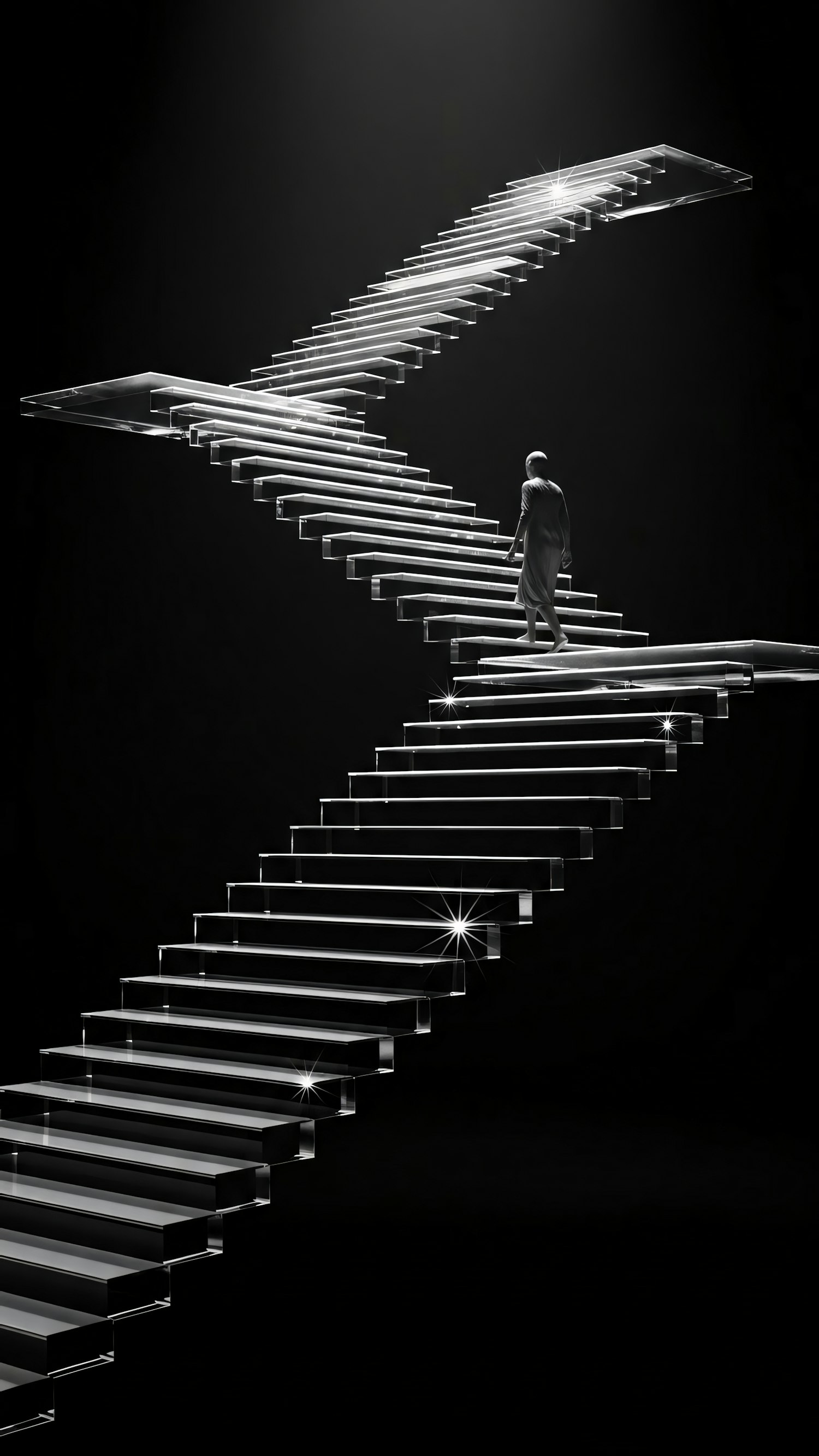 A person ascends a glowing, transparent staircase in a dark, surreal setting, evoking mystery and wonder.