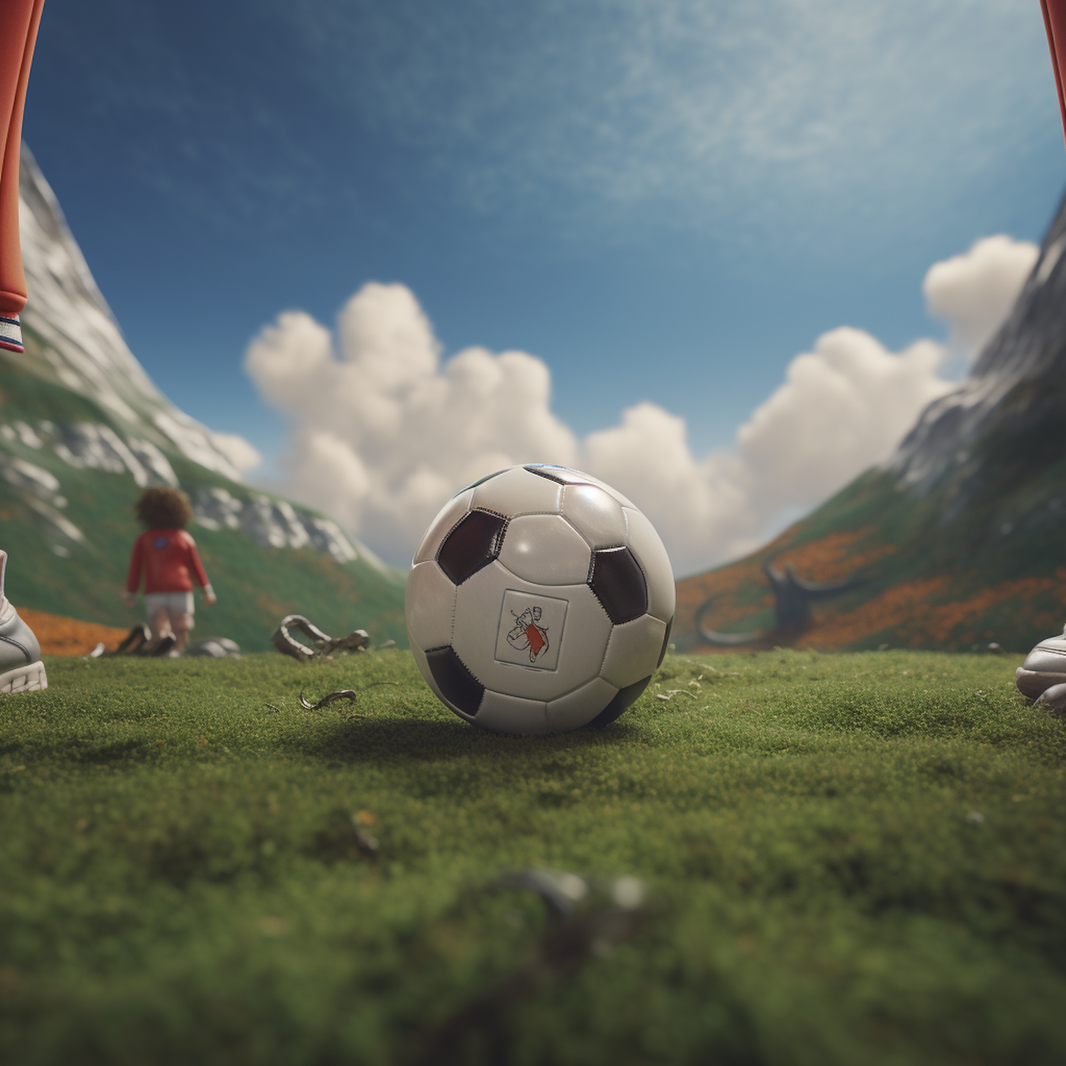 Soccer ball on a green field with mountains, a child in red, and a bright sky, framed by players' legs, suggesting a game.