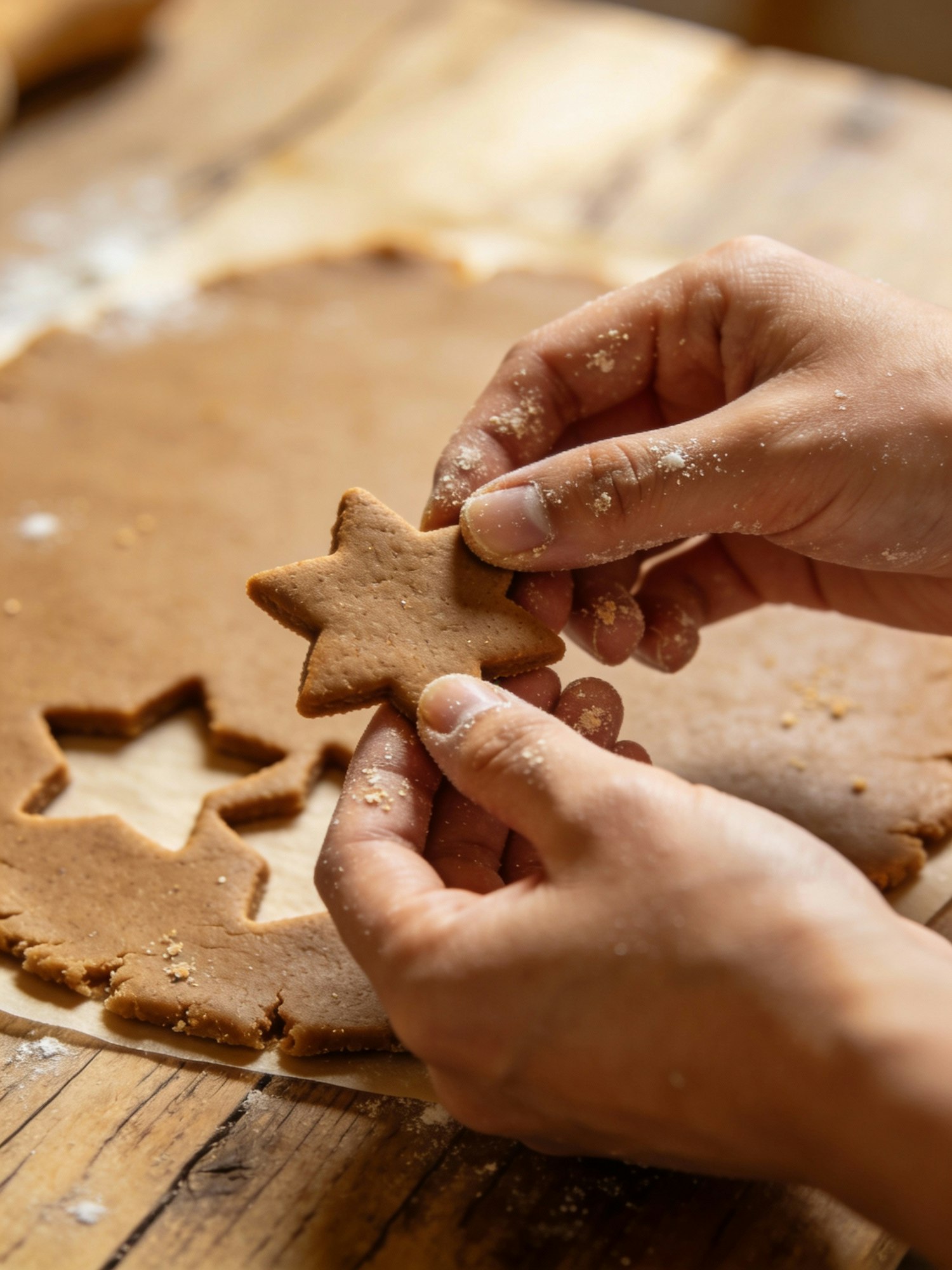 Hands carefully lifting a freshly cut star-shaped gingerbread cookie from the dough, crumbs on fingertips, visible flour particles, wooden table texture softly lit by warm golden light, shallow DOF creating dreamy background blur, editorial food photography mood, 50mm, f/2.2, ISO 200. Negative: faces, props with logos, artificial plastic textures.