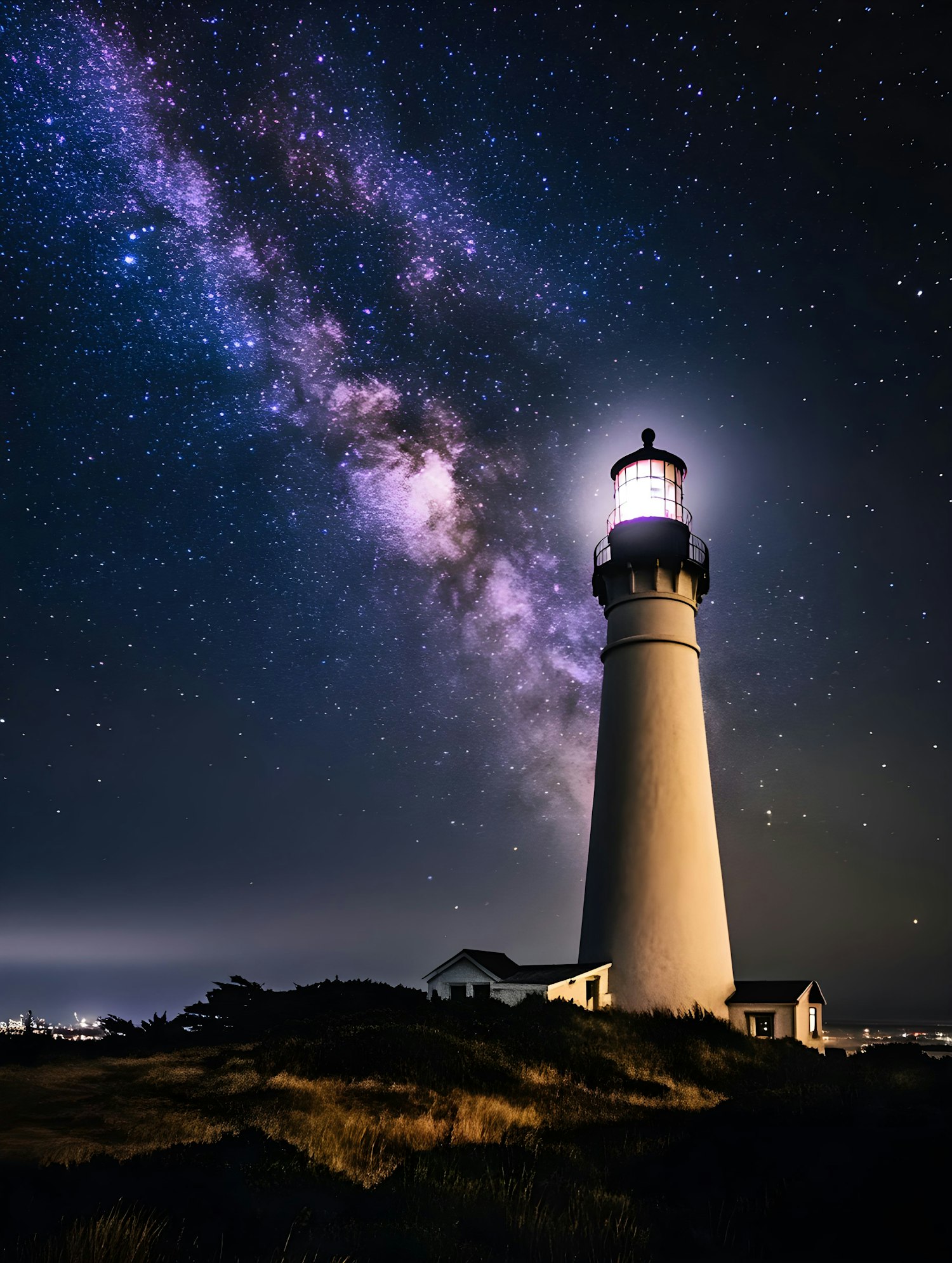 Majestic lighthouse under a starry sky with the Milky Way, casting a serene glow on the surrounding landscape.