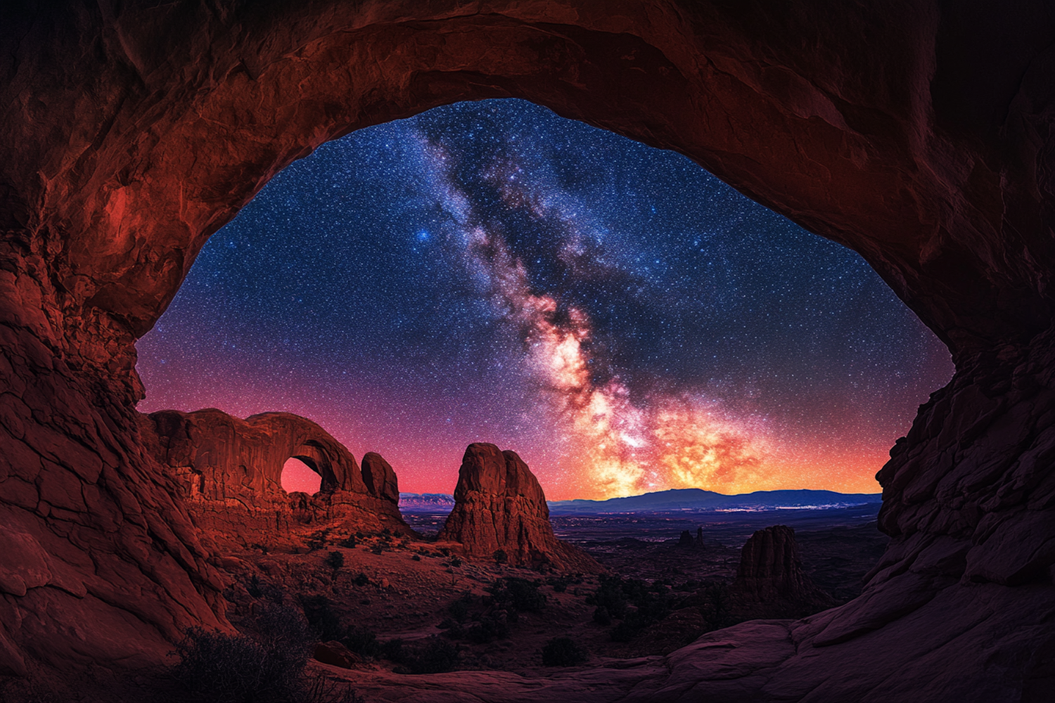 Stunning view of a rock arch framing the Milky Way in a starry night sky, with vibrant colors and rugged landscape.