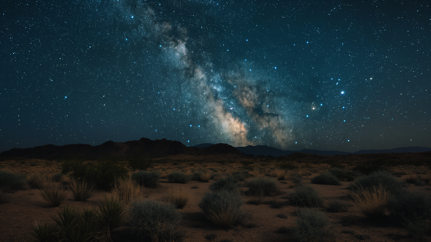 Stunning night sky with Milky Way over a desert landscape, featuring stars and distant mountains.