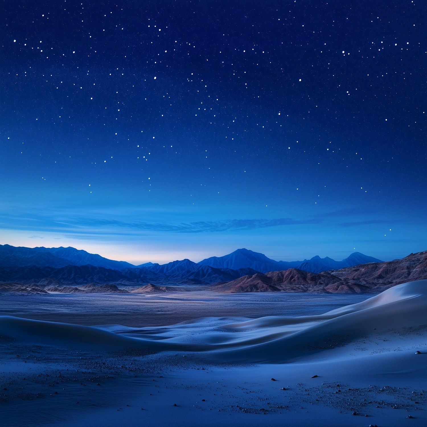 A tranquil desert night with starry skies, rolling dunes, and distant mountains bathed in cool blue tones. Perfect for stargazing vibes.