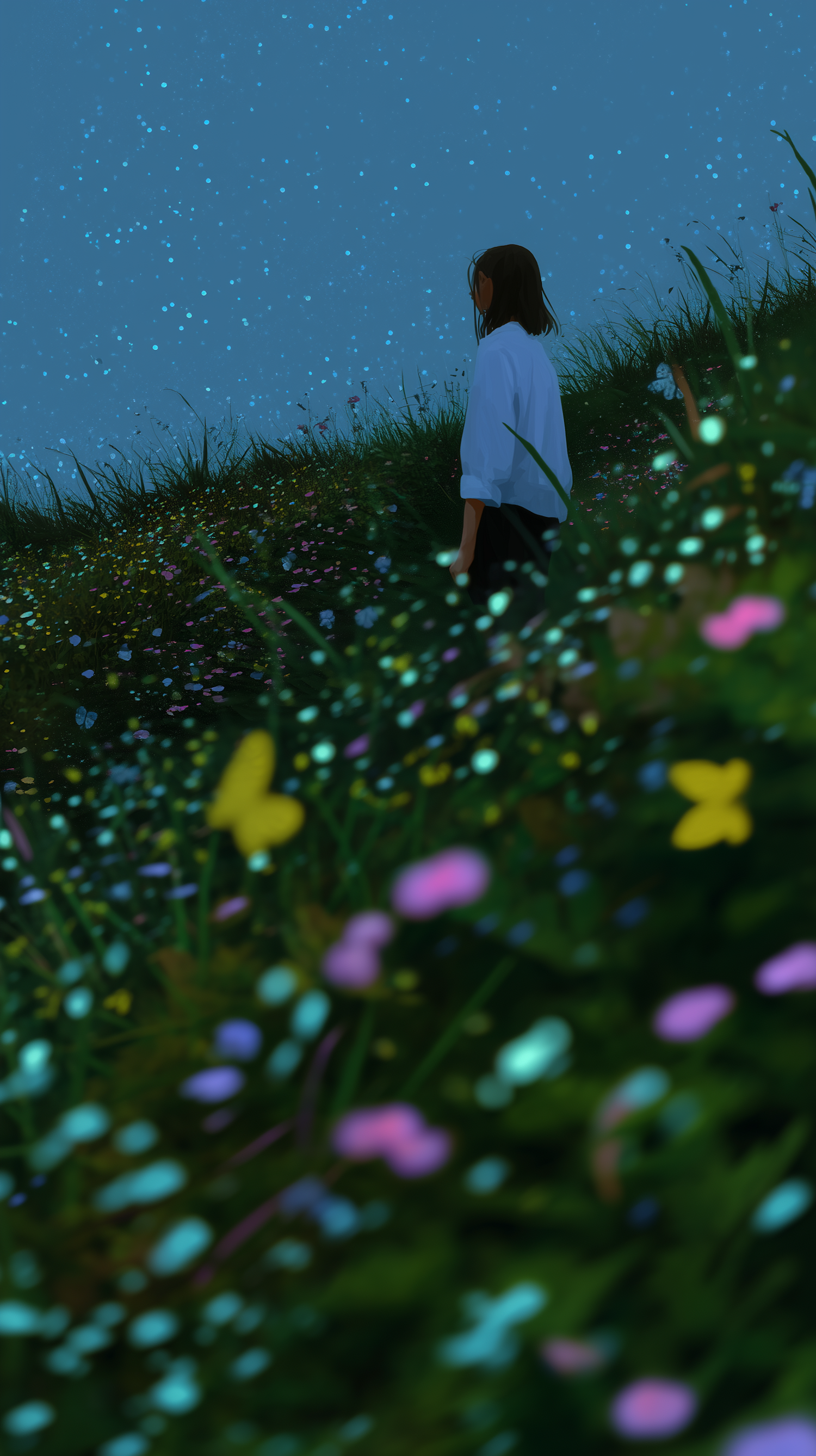 A dreamy illustration of a person in a glowing meadow under a starry night sky, surrounded by vibrant flowers and butterflies.