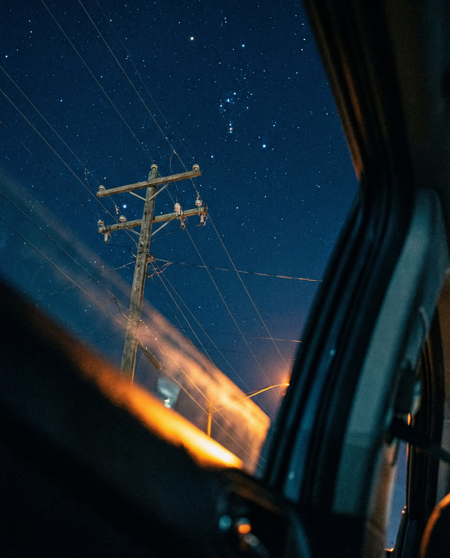 A starry night sky seen through a car window, featuring a utility pole and warm streetlight glow contrasting the cool night tones.