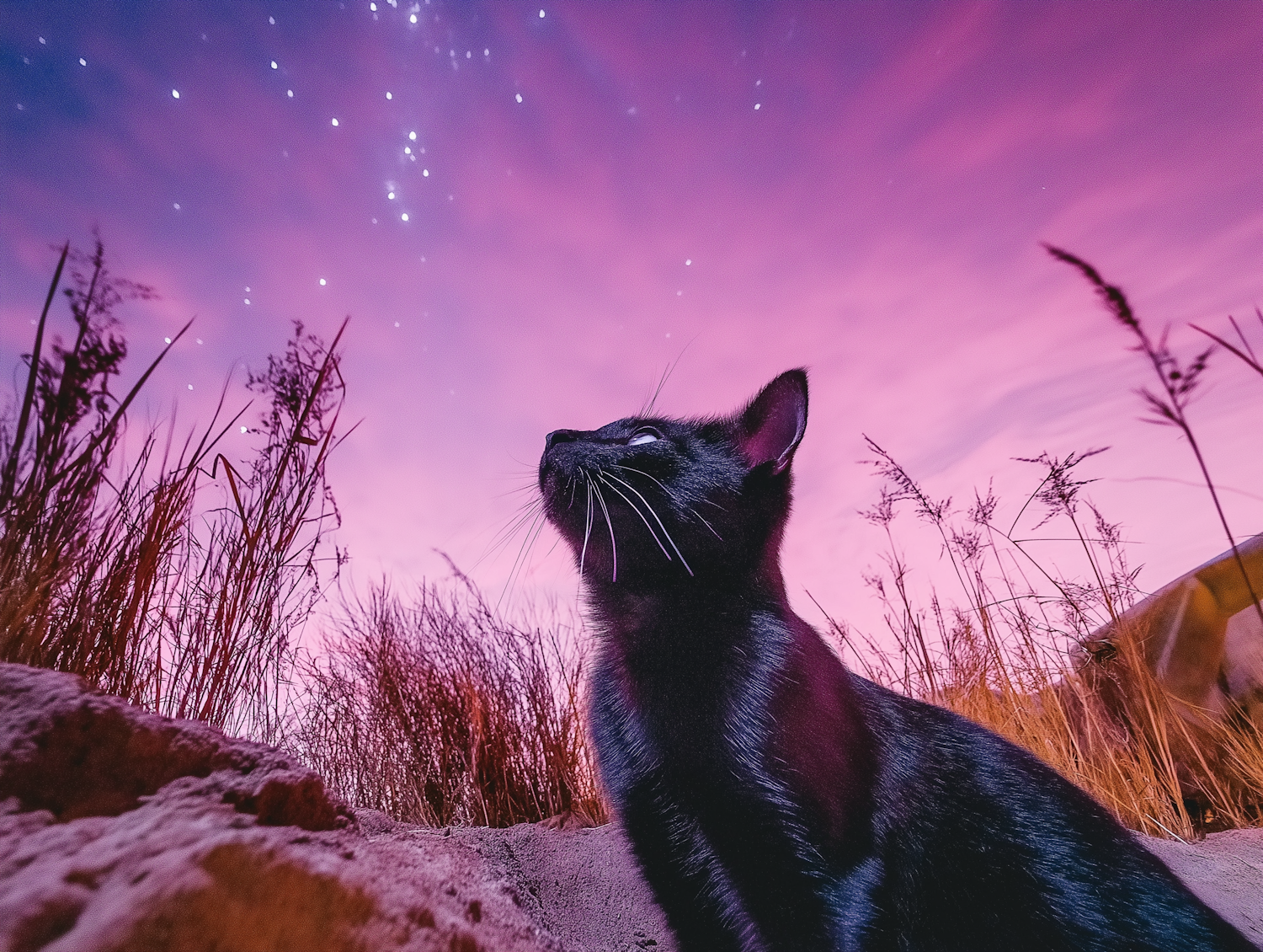 Black cat gazes at starry pink-purple sky, surrounded by tall grasses. Enchanting and serene scene with a magical atmosphere.