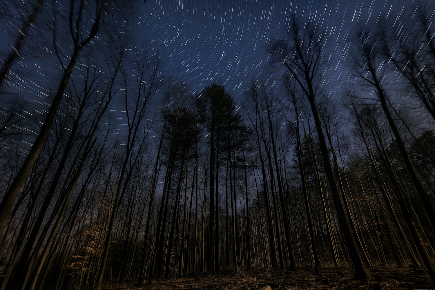 Star trails swirl above a forest of tall, leafless trees, creating a dynamic night scene with a sense of motion and time.