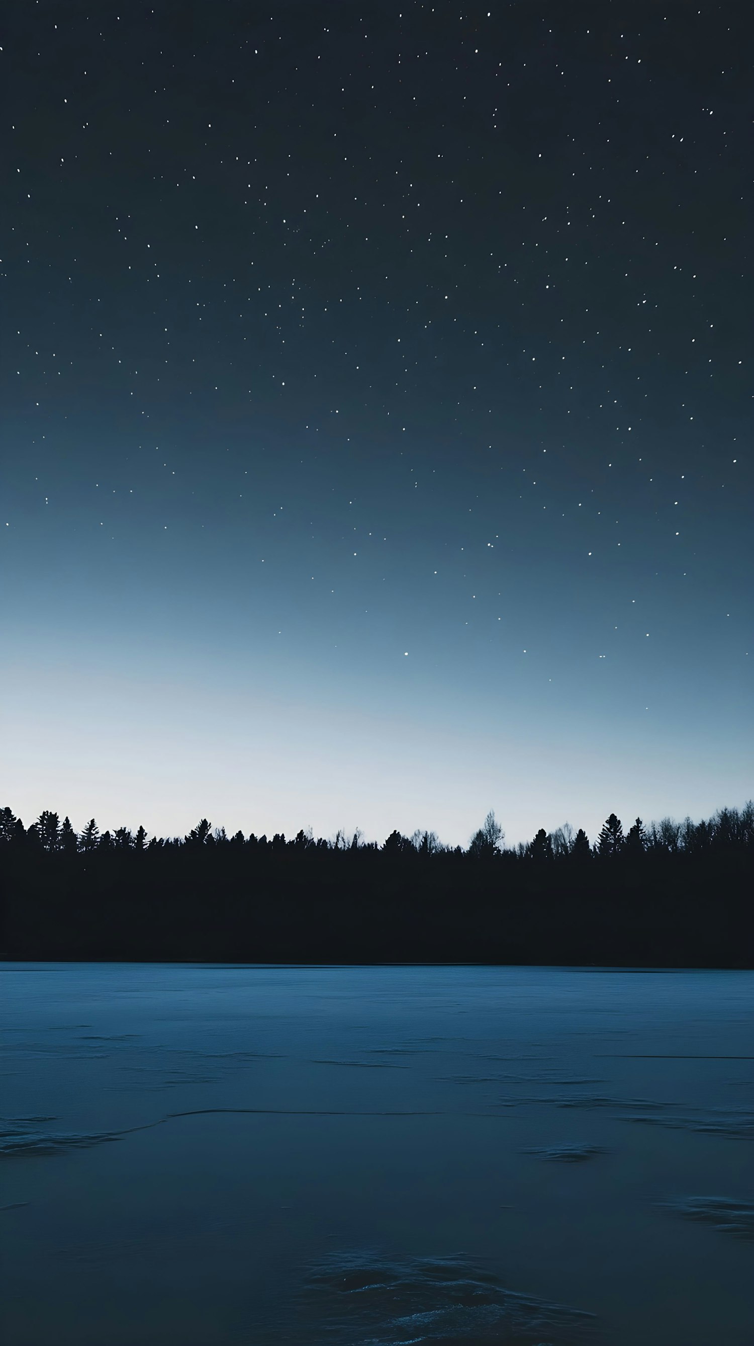 Starry night sky over a frozen lake with a silhouette of a forest on the horizon, creating a serene and tranquil scene.