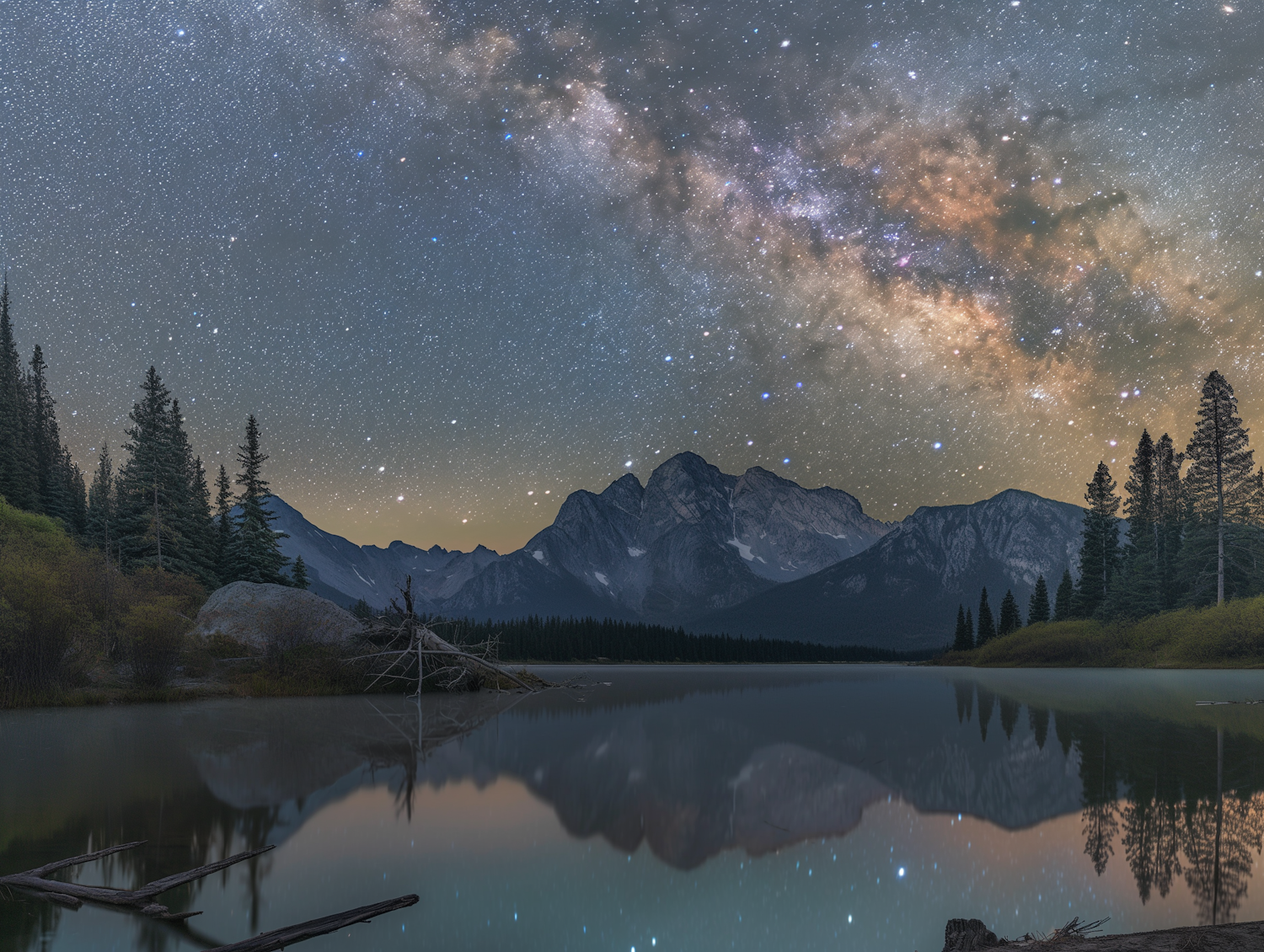 Stunning night landscape with Milky Way over mountains and a reflective lake, surrounded by pine trees under a starry sky.