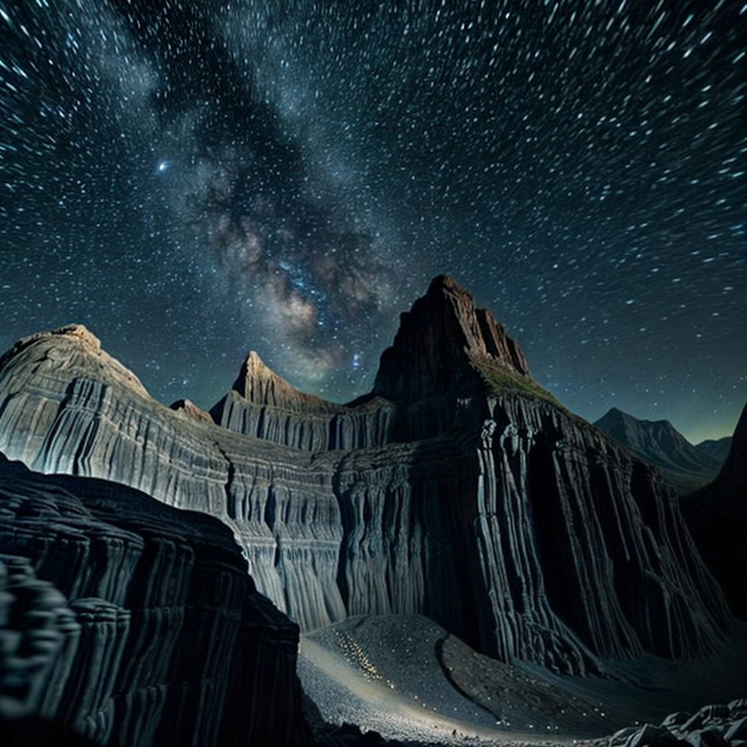 Majestic rock formations under a starry sky with the Milky Way visible, creating a dramatic and mystical night scene.