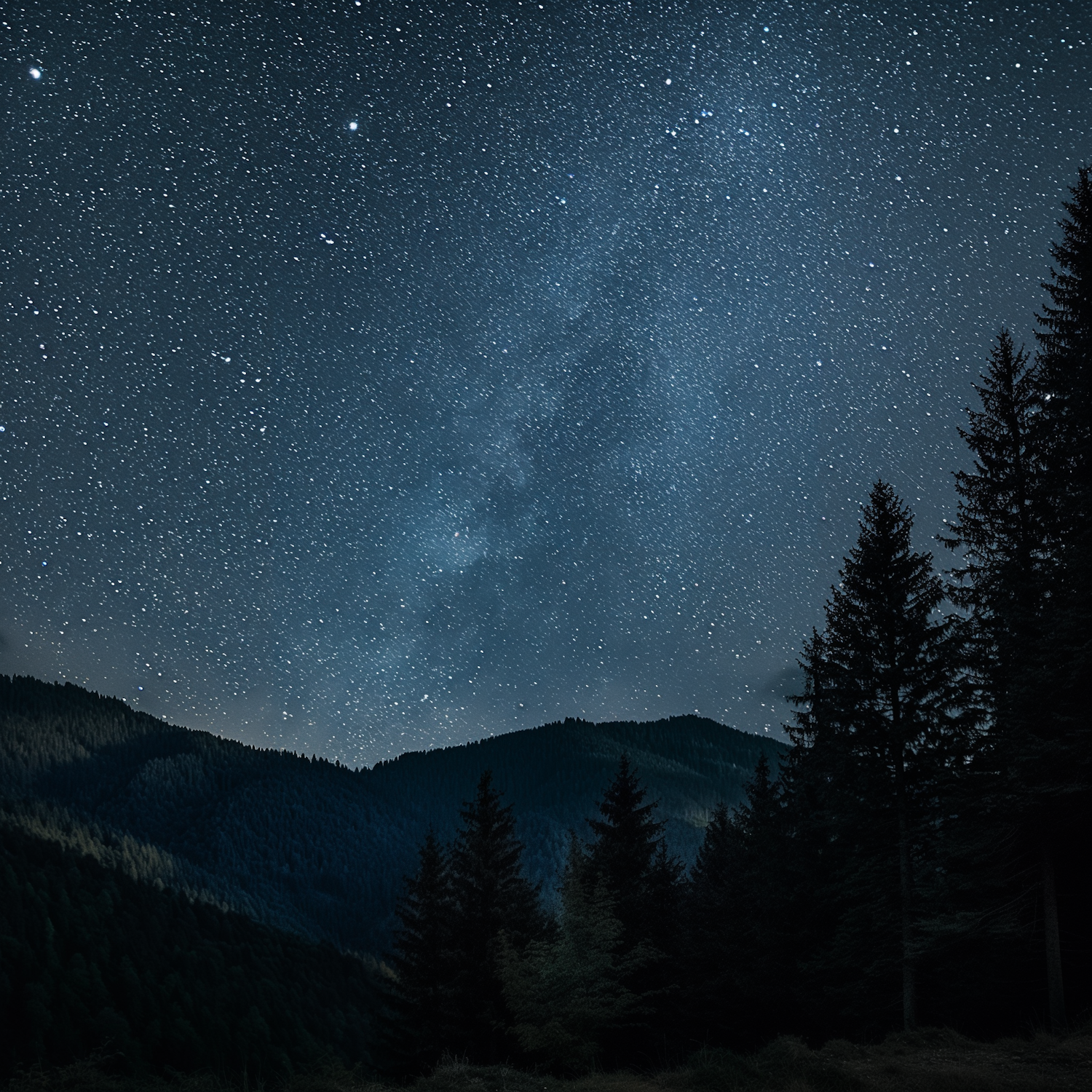 Starry night sky over a silhouette of evergreen trees and mountains, with the Milky Way faintly visible.