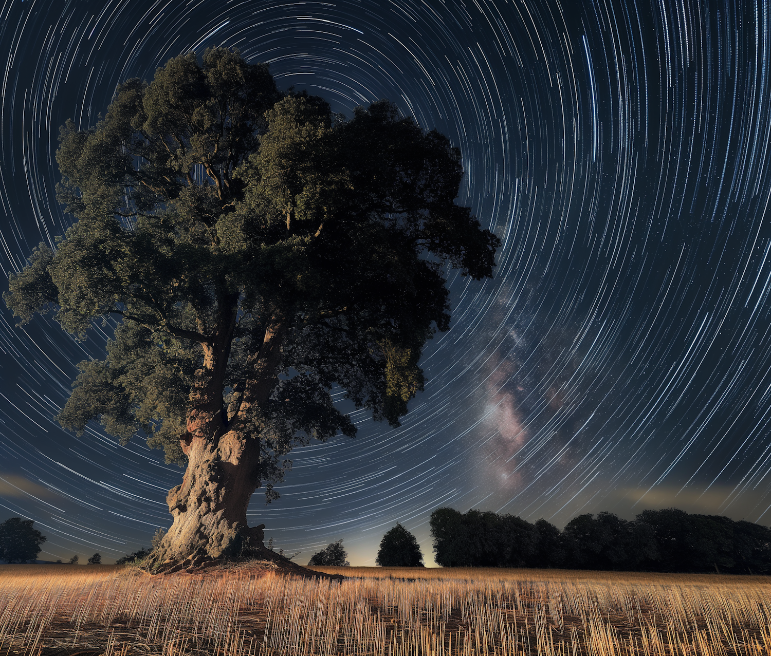 Majestic tree under swirling star trails and Milky Way, creating a serene and captivating night landscape.