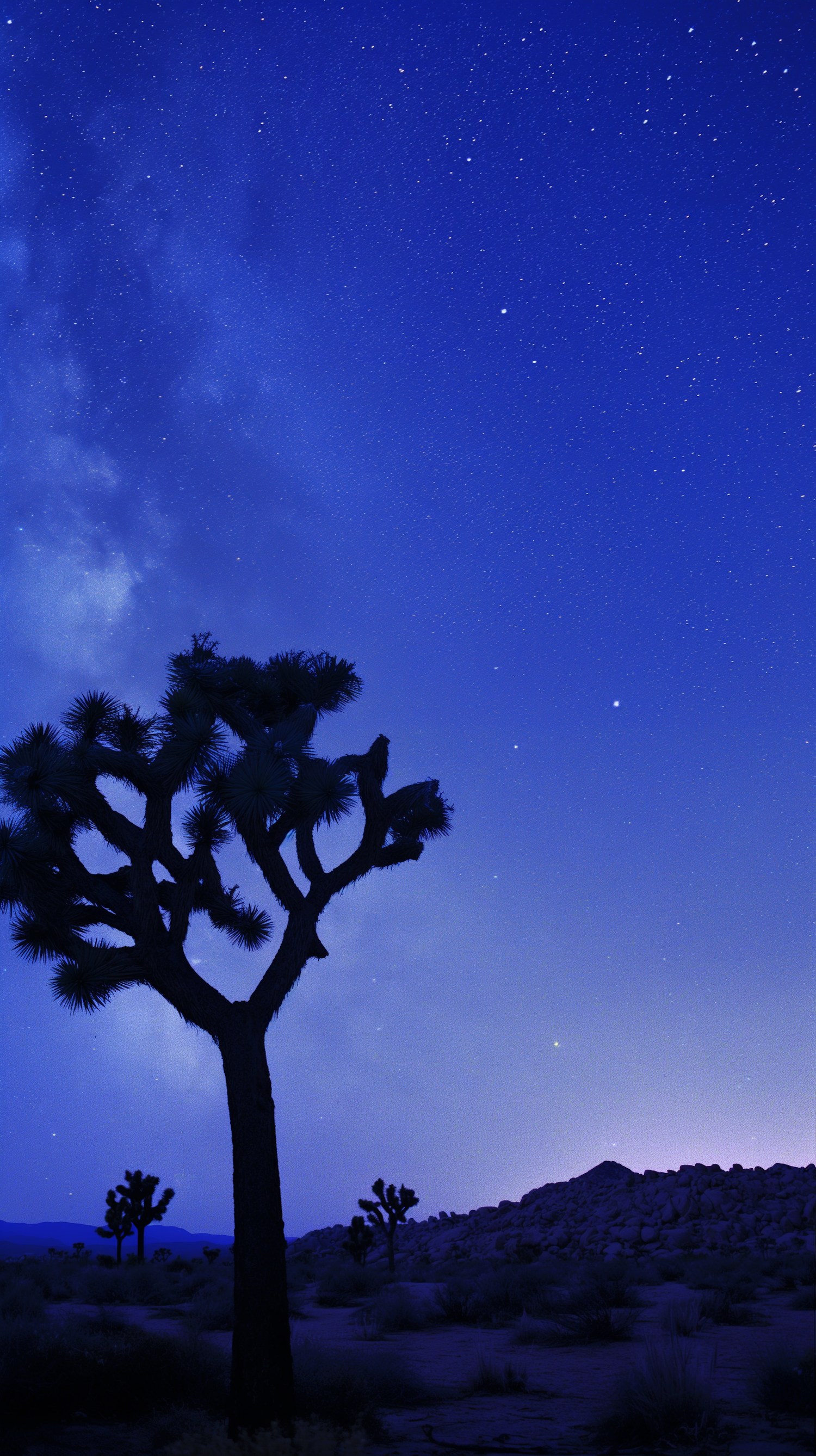 Stunning night sky over a desert with silhouetted Joshua trees and a star-filled sky, creating a tranquil and awe-inspiring scene.