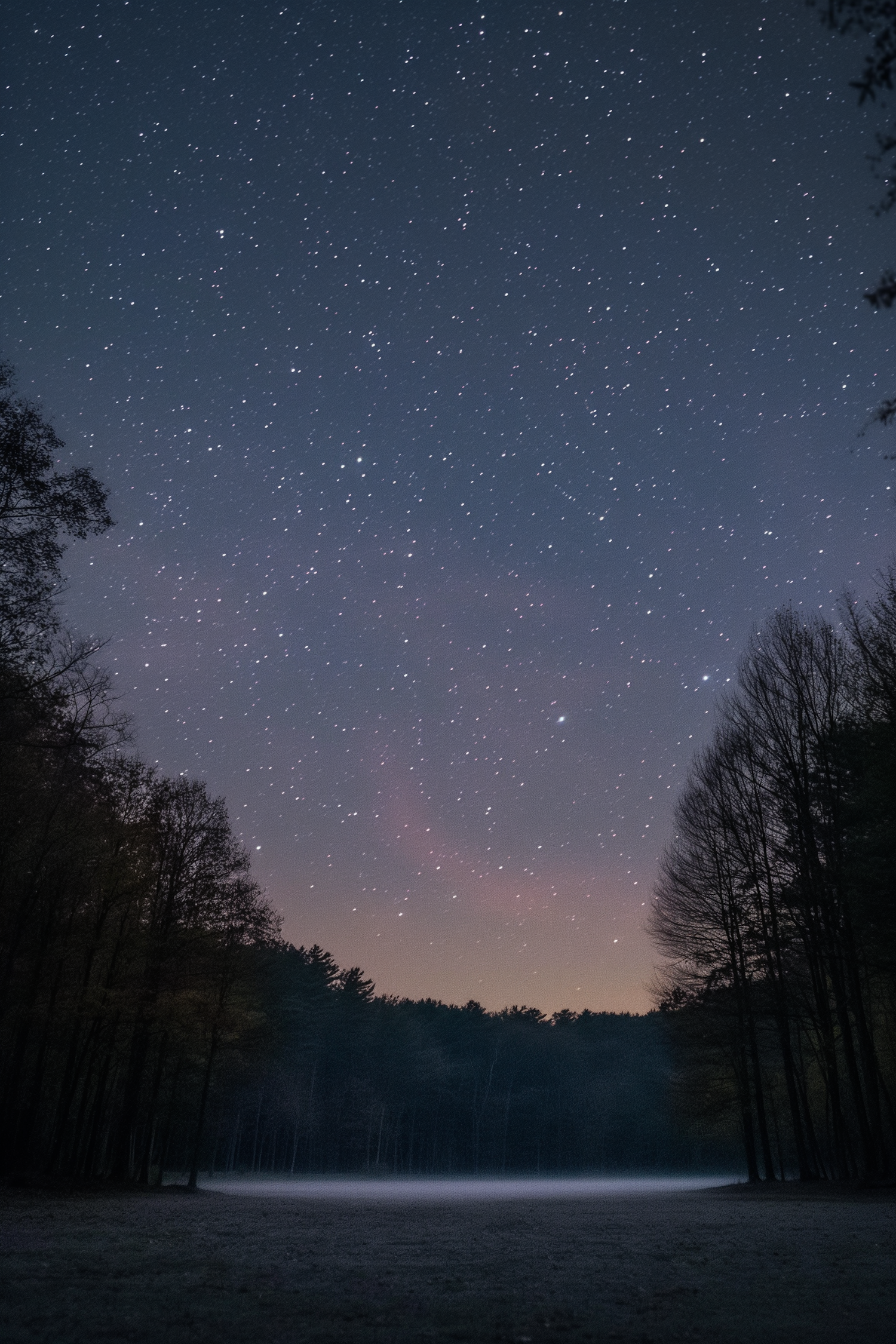 Starry night sky over a misty forest clearing, with silhouetted trees and a faint glow on the horizon.