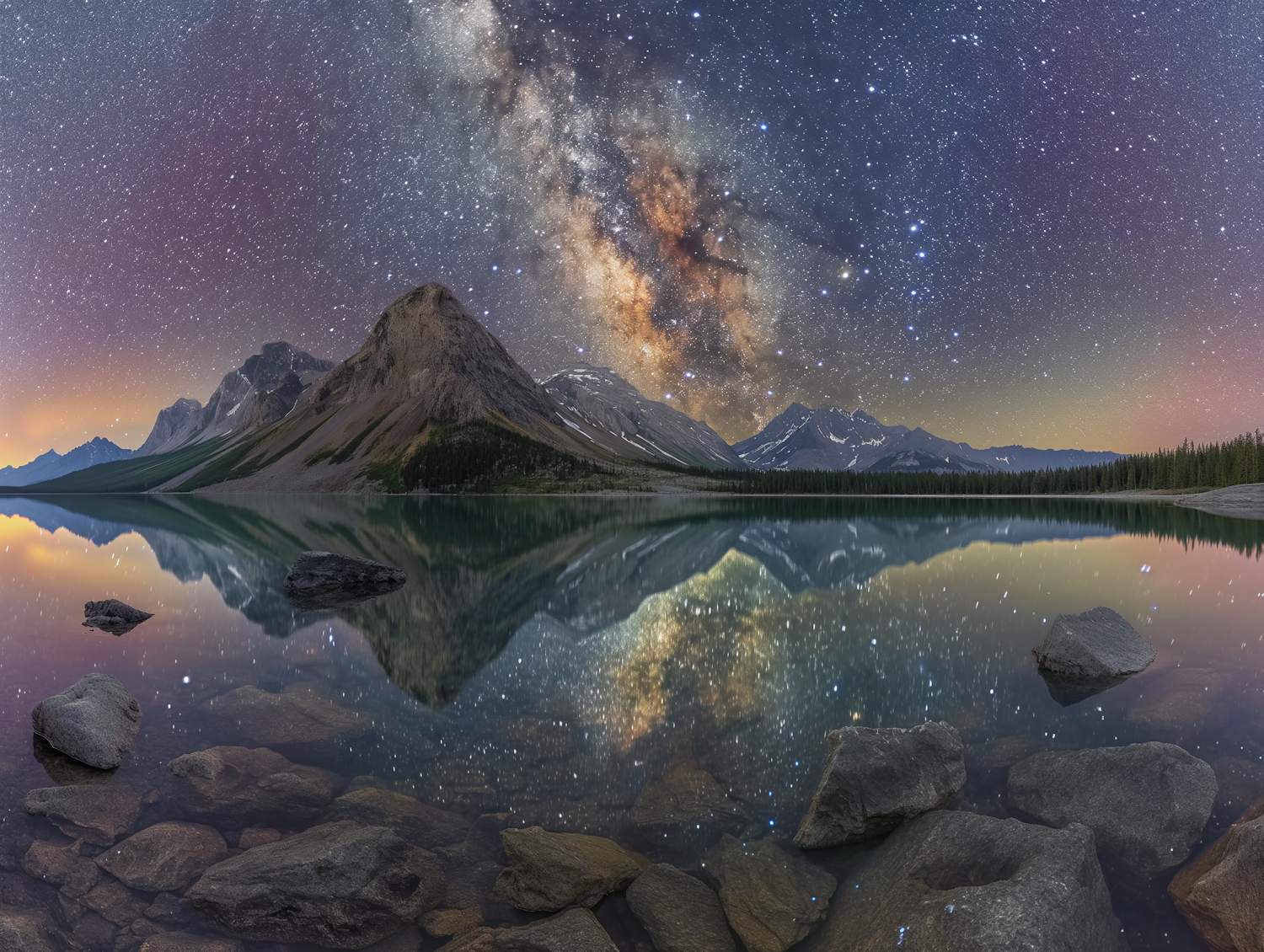 Stunning night landscape with Milky Way over mountains and lake reflection, creating a serene and symmetrical natural scene.